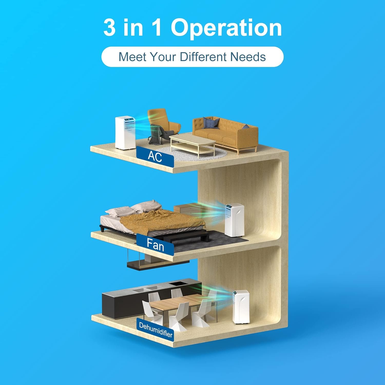 【Not Just an AC】 To meet your diverse needs, our machine offers three personalized operating modes to choose from – cooling, which can effectively help you beat the summer heat; dehumidification, which removes humidity from the air; or use the 2-speed fan mode to create a refreshing breeze. The machine also features a built-in temperature sensor that automatically adjusts the compressor’s operation according to the current temperature environment, reducing energy consumption.