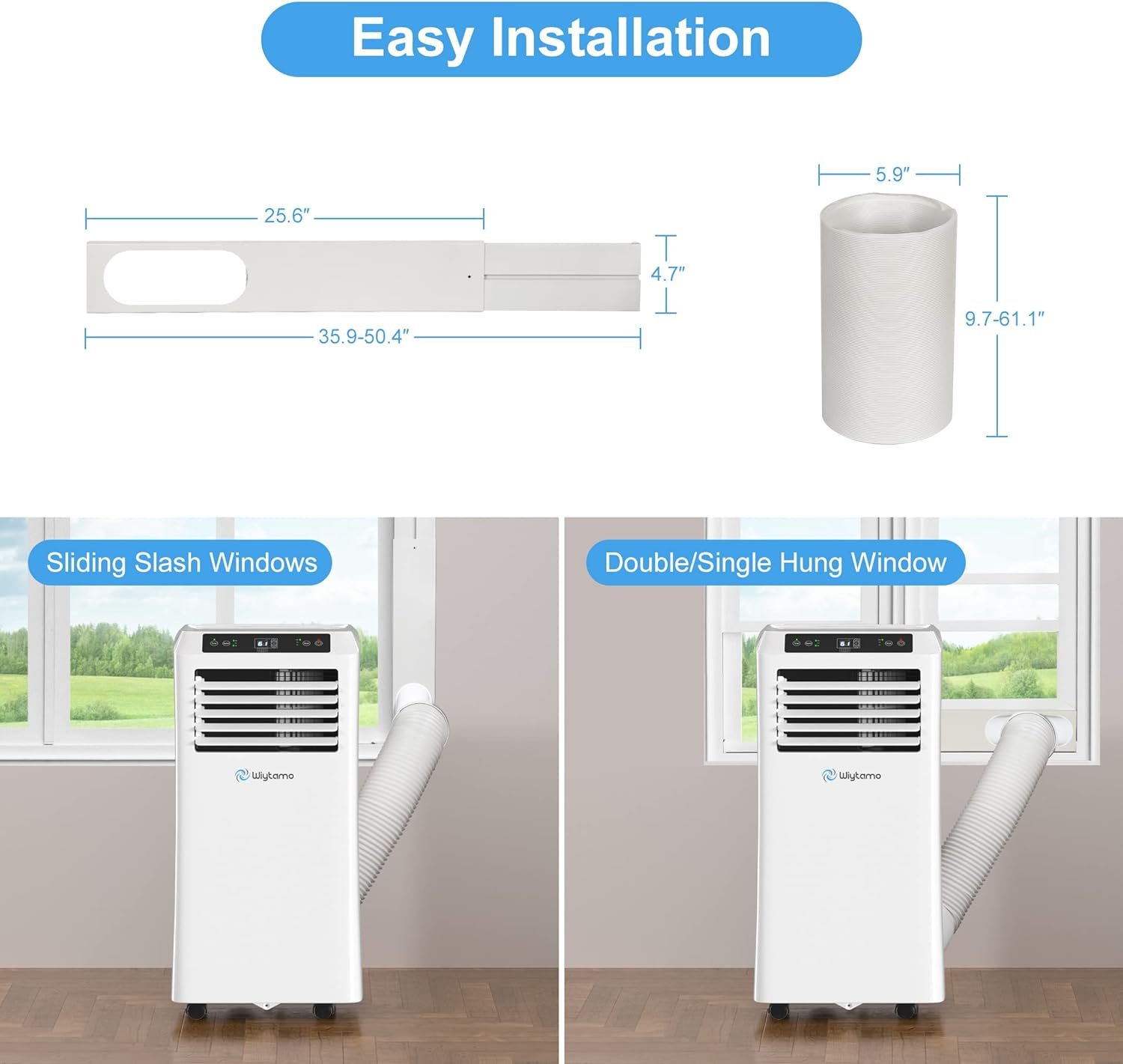 【Easy-To-Install】 Our portable air conditioner comes with a sliding window kit and detailed installation instructions, making it suitable for any vertical or horizontal sliding window (compatible with window sizes between 25.6” and 50.2”). You can connect the included 61” long flexible hose and window kit adapter, then turn on the device and select the mode you want to start enjoying the cool air from the comfort of your couch. No additional tools are required for assembly, and anyone can complete the installation process.
