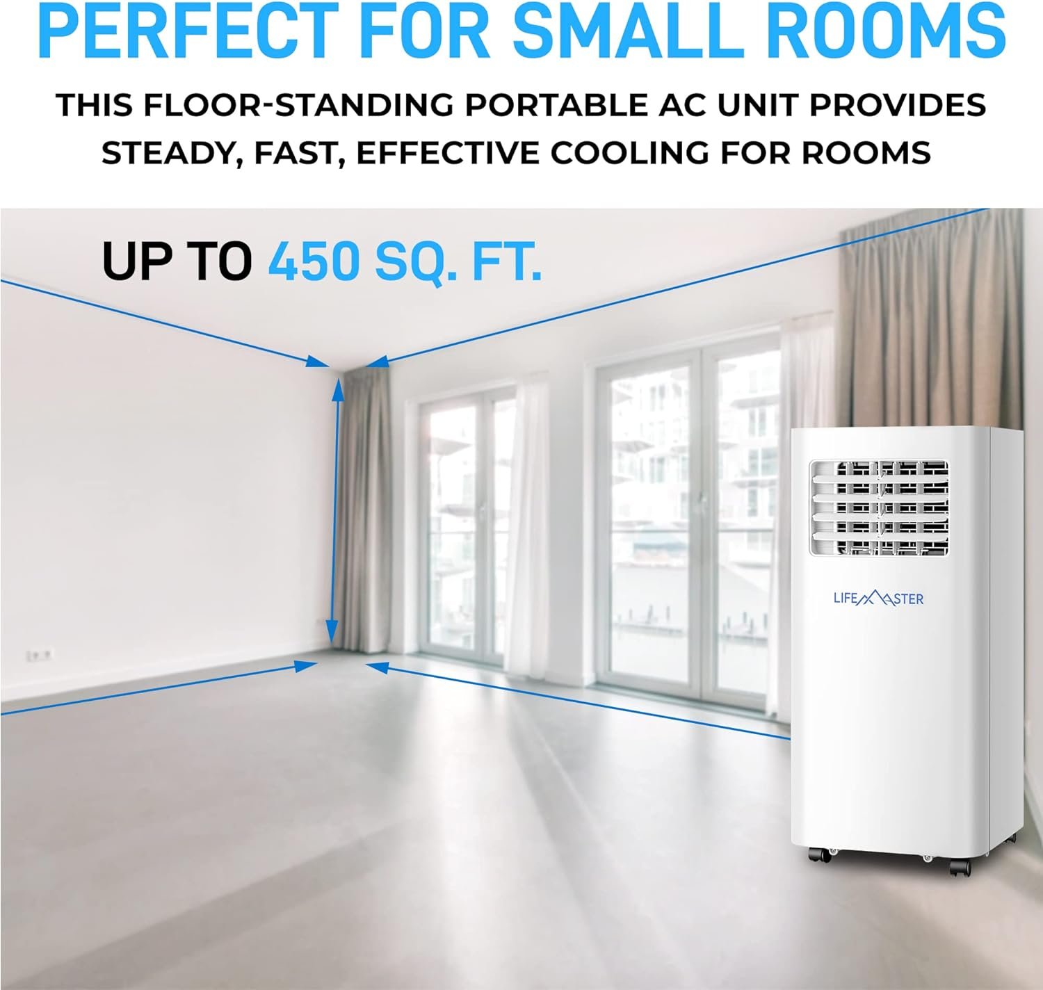 PERFECT FOR ALL ROOMS – This floor-standing portable AC unit provides steady, fast, effective cooling for rooms up to 450 sq. ft. It’s the ideal small air conditioner for dorms, apartments, cabins, campers, offices, bedrooms, or living rooms.