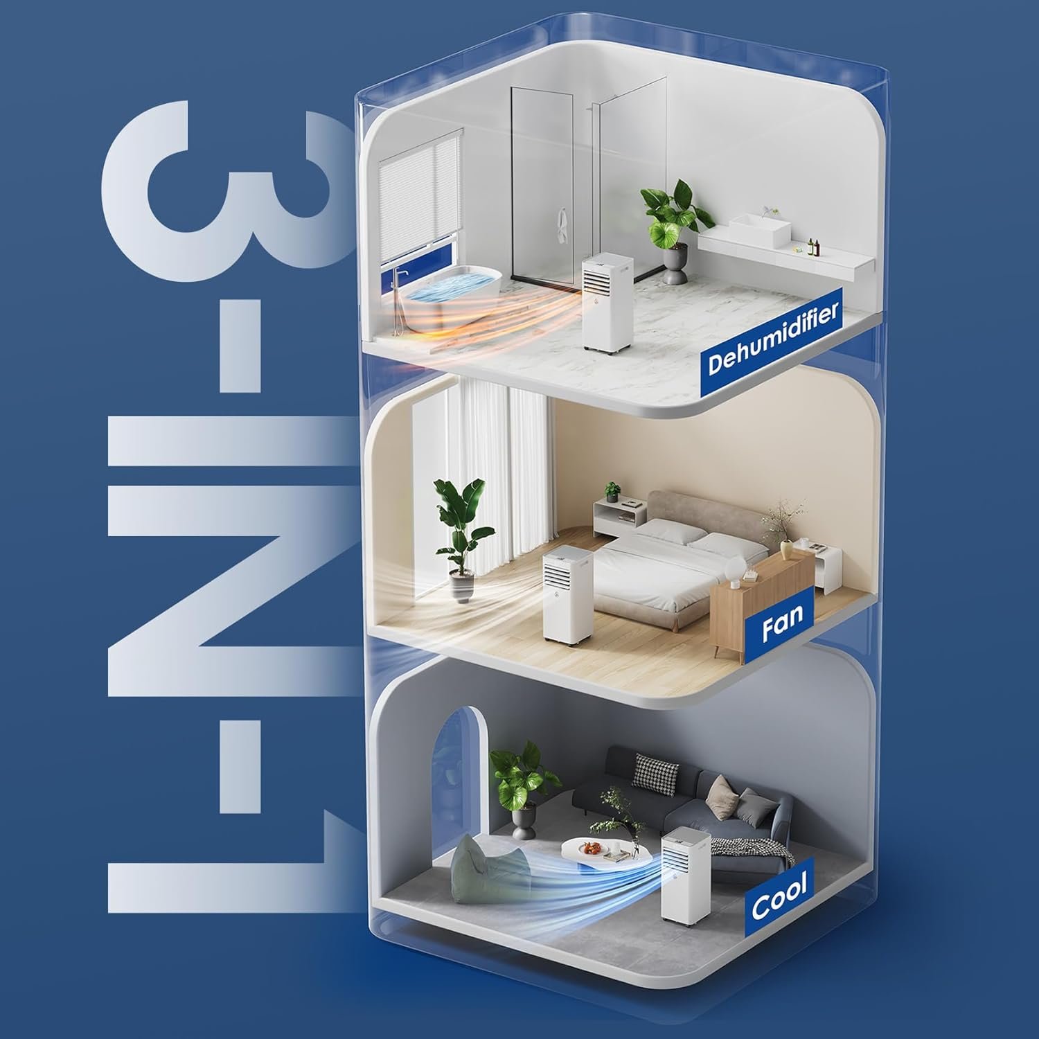 Beyond Just Cooling: Discover the versatility of our portable AC, featuring three energy-saving functions tailored to your cooling and ventilation preferences: cooling, dehumidification, and fan modes. With an impressive dehumidifying capacity of 70 pint/day and a hassle-free, bucket-less, self-evaporating operation, it ensures your living space remains cool, clean, and dry. This truly adaptable AC unit not only combats the heat but also creates a comfortable atmosphere perfect for unwinding with a good book or indulging in gaming sessions.