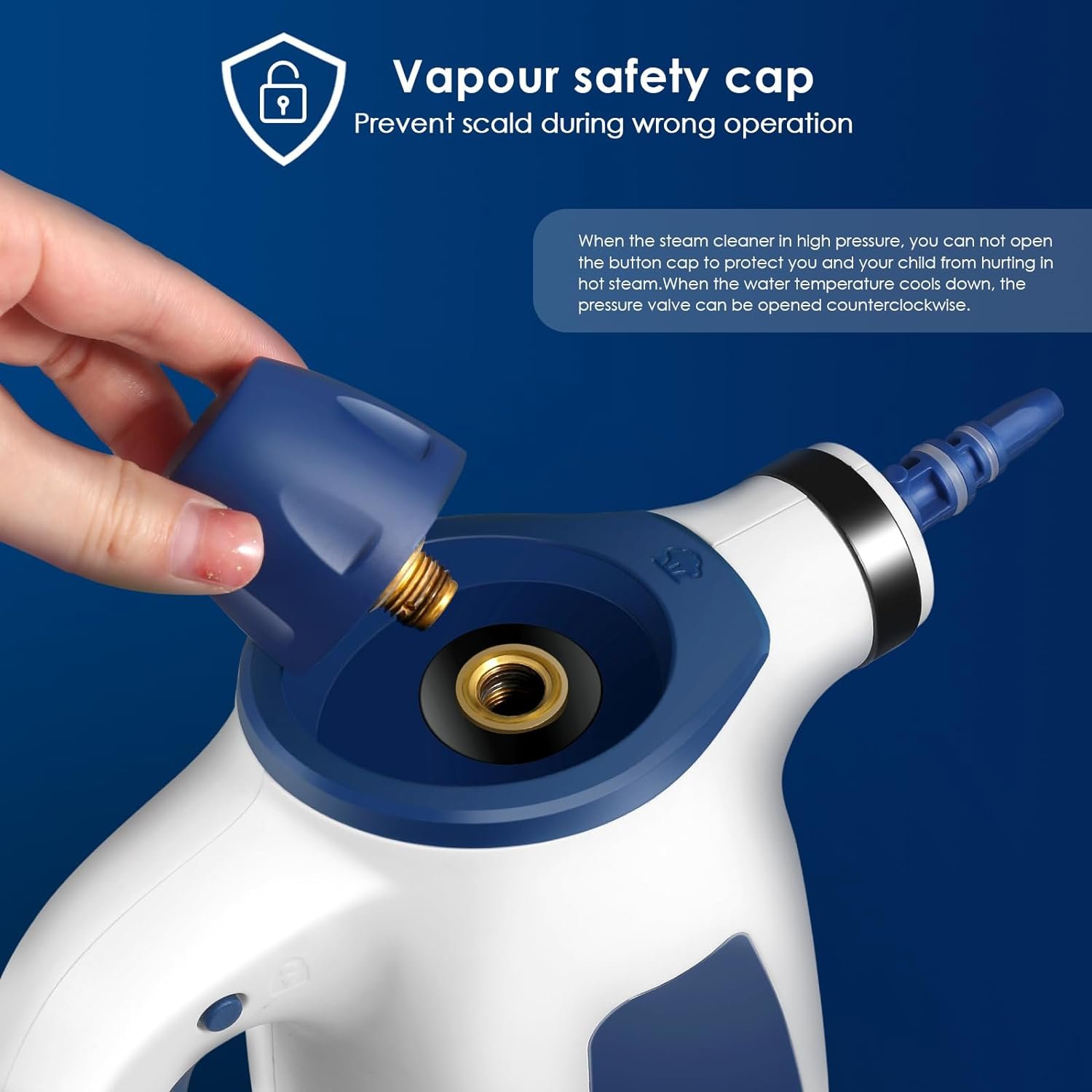 [LIGHTWEIGHT AND PORTABLE]: This handheld steam cleaner is easy to carry from one place to another place with lightweight and portable body. And portable unit comes with a long 9. 8-foot cord for convenient indoor and outdoor use. There is a safety lock on the handle and a safety cap on the top to ensure safety when the steam is in use. Don’t worry about scalding by hot liquid or steam.