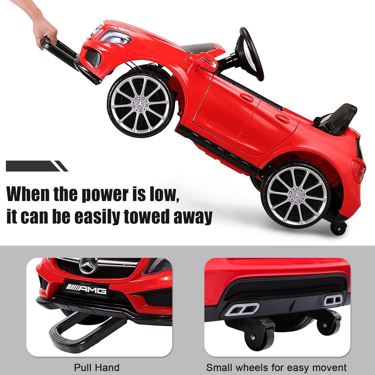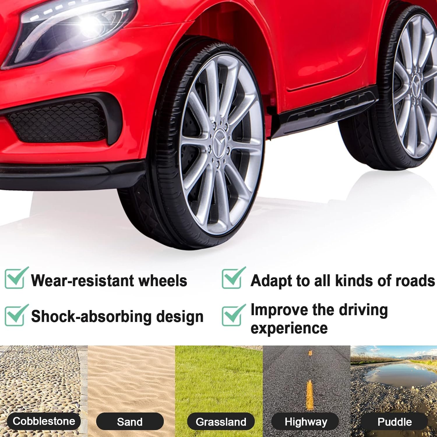 Four solid wheels with shock-absorbing suspension system are wear-resistant and explosion-proof, which ensures the Benz car runs smoothly and stably through a nice clear path, bumpy road, tall grass, or up and down a hill.