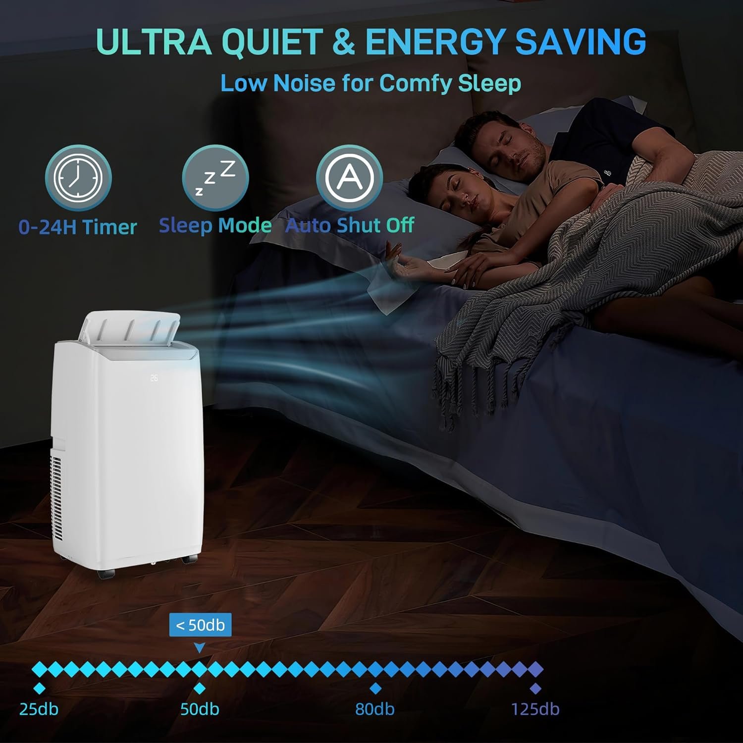 AC unit operates at just 51db even at maximum airflow. Enjoy a peaceful and tranquil environment while staying cool and comfortable.