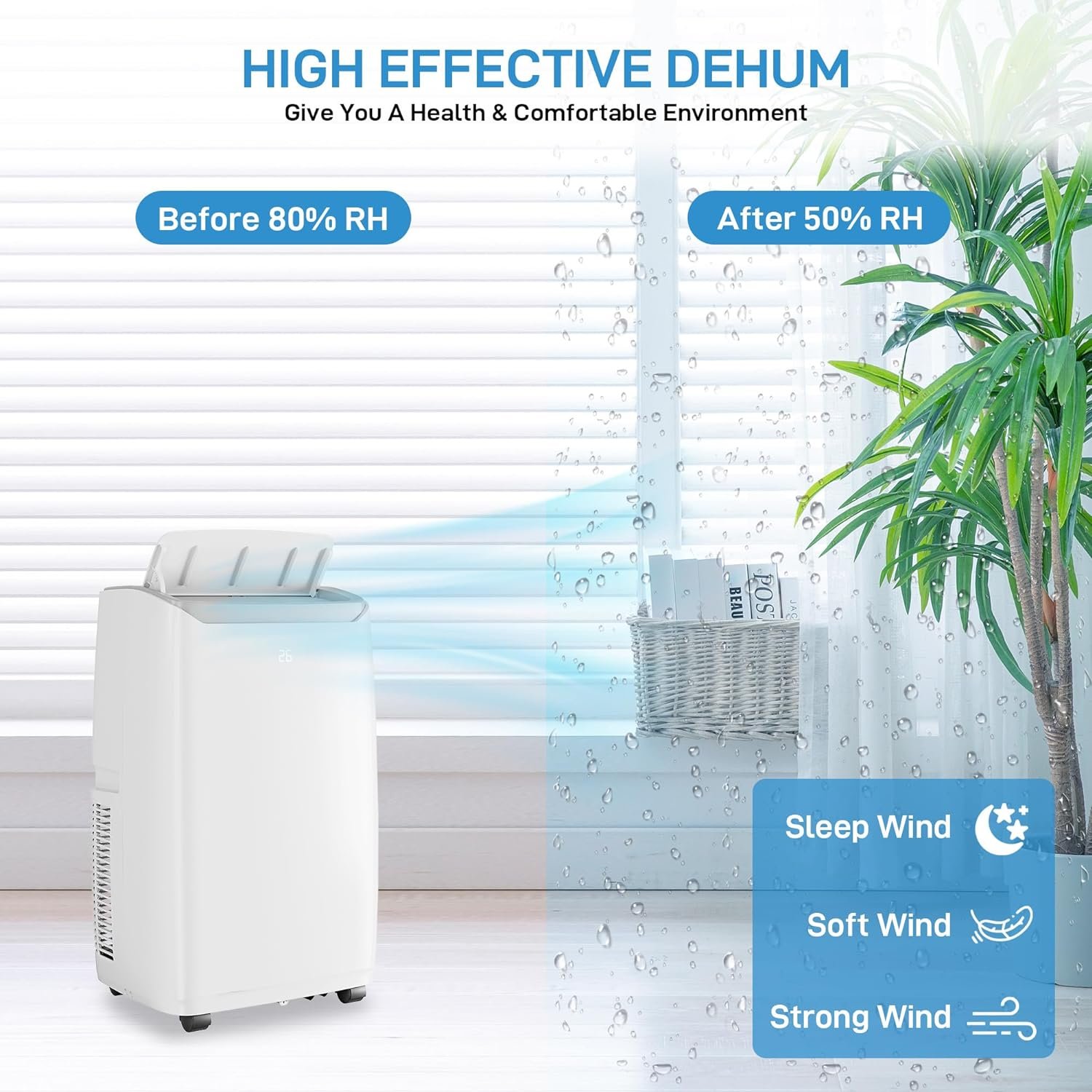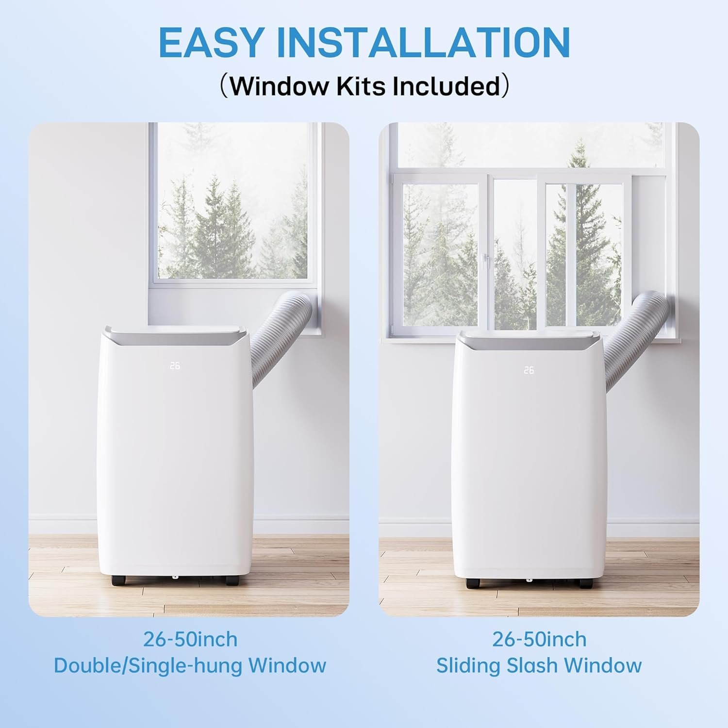 Simple & Quick to Install: Just roll this portable air conditioner with caster wheels into any room with a double-hung or sliding window. Attach the included exhaust hose & window kit & plug it into an outlet. No extra tools are needed for assembly! No need to pay expensive installation fees, can do it by yourself.