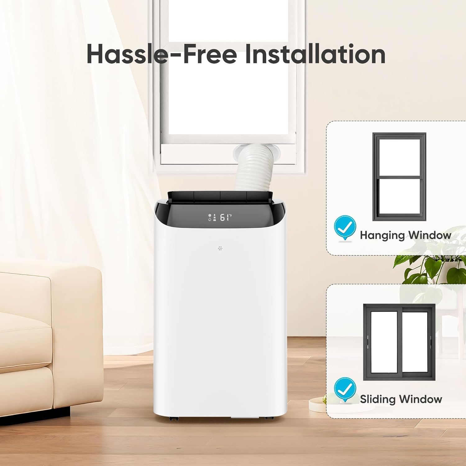 【Front LED Panel & Remote Control】 Our portable ac unit is equipped with an easy-to-read Front LED Display,combined with full-function remote control with an effective range of up to 28 feet, has LED display, you can easily set the temperature and wind speed while sitting on the sofa or lying on bed, no need to get close or stand up, maximize the convenience of mobile air conditioners at any conner of your room.