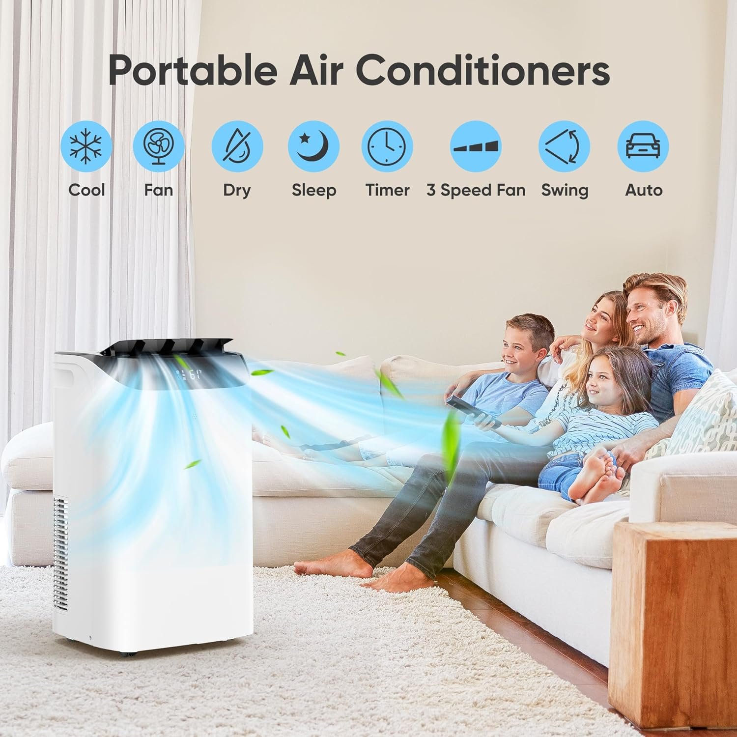 【3 Fan Speeds & Auto-Swing】: The air conditioner portable built-in upgraded compressor and 3 speeds powerful fan system for fast cooling and reduced energy consumption, with 0-80° Wide-angle airflow and auto-swing function cools down any conner of your room in all directions, angle can be freely adjusted and the air is flowing evenly in the whole room