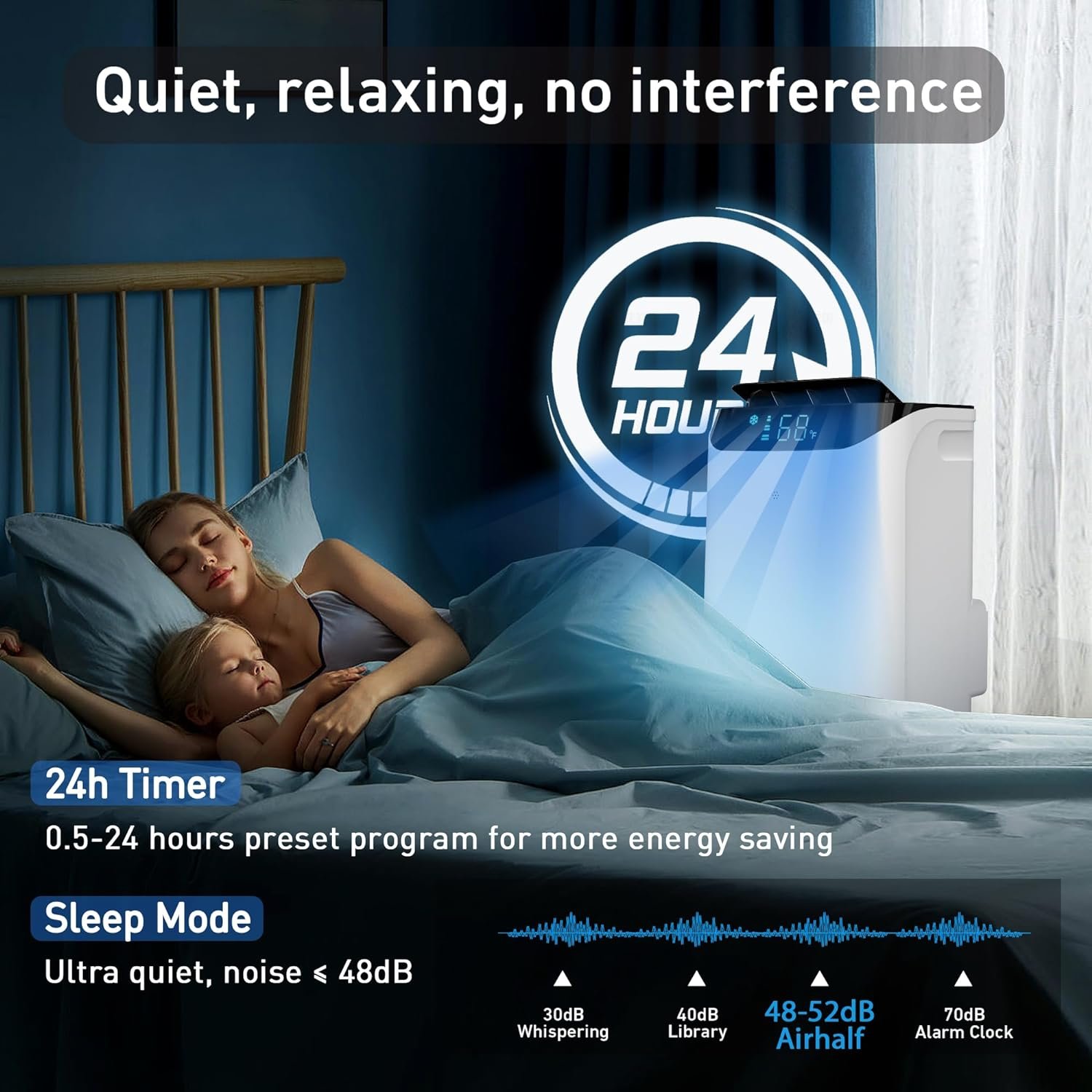 【Quiet Sleep Mode & Preset Timer】: The noise of room air conditioners is about 52db in normal cooling mode, sleep mode noise down to 48db. This portable air conditioner helps you create a ultra quiet and comfortable environment where you can work, meditate, sleep or relax without distractions. You can also preset to stop or start the ac unit after 0.5-24 hours, all these funtional modes are money-saving and more smart.