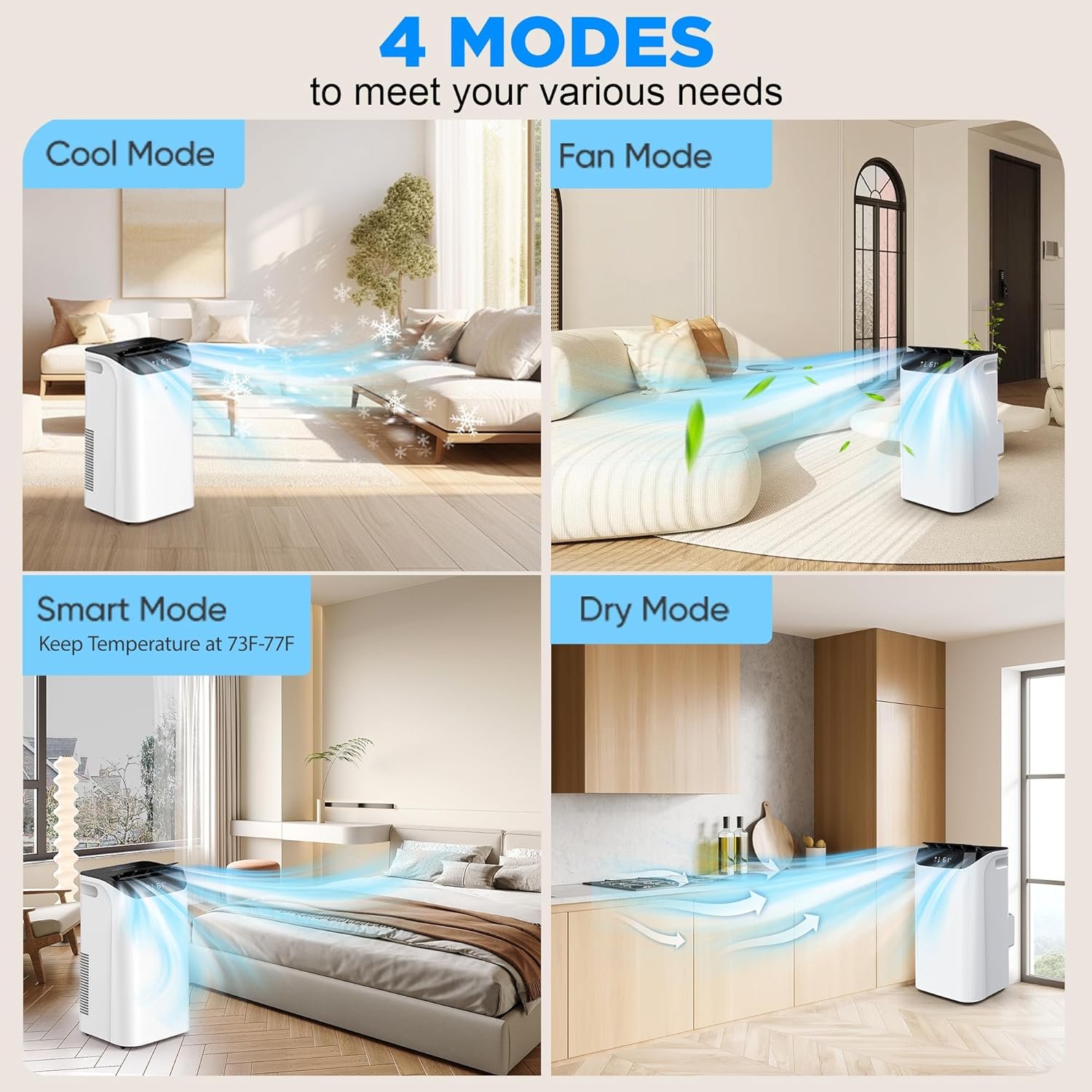 【Cooling/Dehumidify/Fan Function】: The 3 in 1 Portable ac unit combines multiple functions in one economical machine. With 4 modes of Cooling/Fan/Dehumidifying, You can freely adjust the temperature in cooling mode, ranging from (61℉ ~ 88℉) in hot seasons. The dehumidifier capacity of 95 Pints/day can effectively reduce the humidity of any room, and as a Power Cooling fan to bring fresh air at all times.