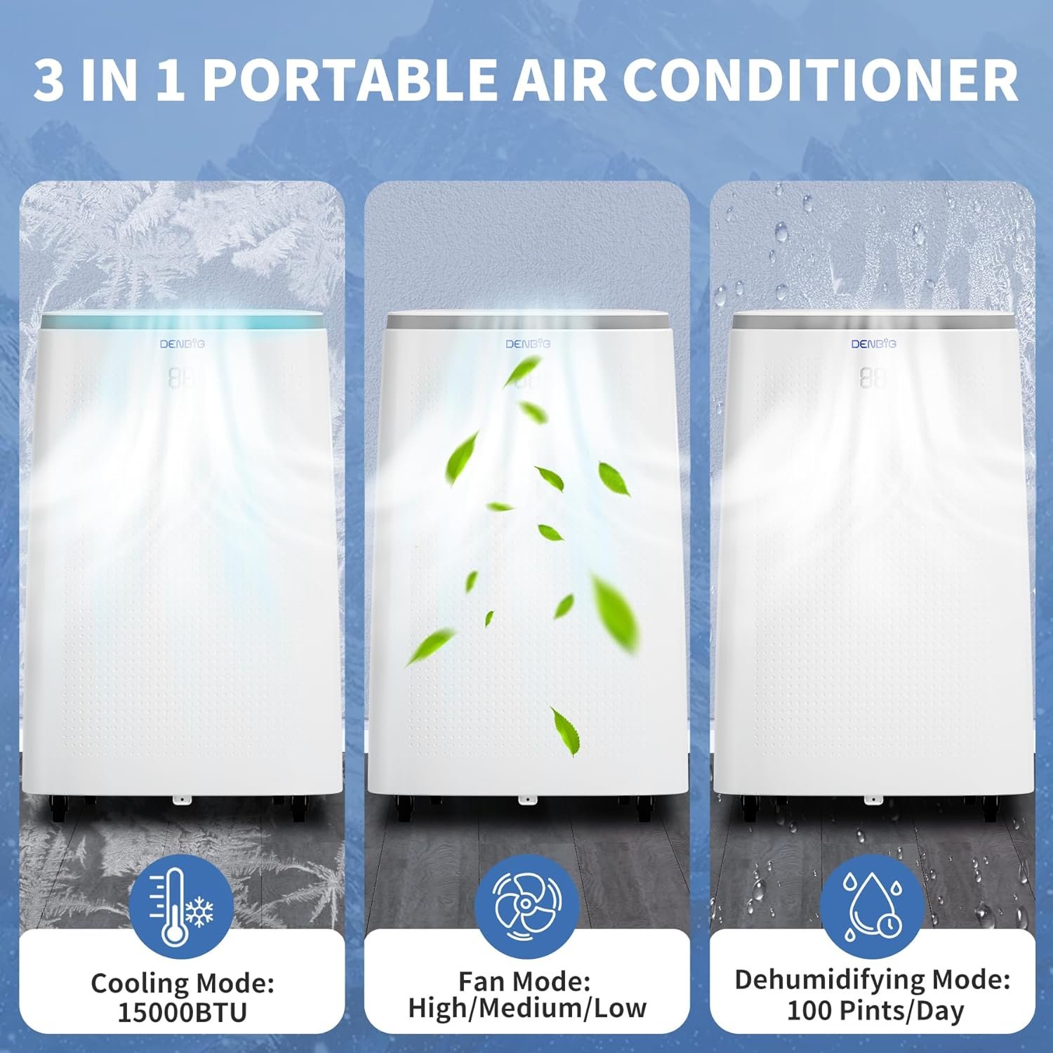3-in-1 Multi-functional: Discover the versatility of our 15,000 BTU air conditioner – not only cools the air but also acts as a dehumidifier and a multi-speed fan. This portable unit also comes complete with a convenient remote control and an easy-to-use LED control panel.