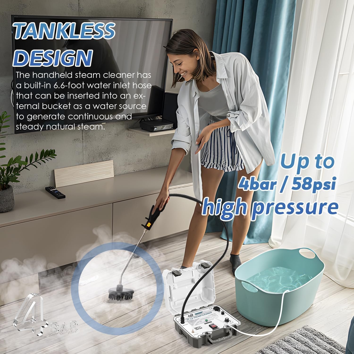 [Tankless Design]: The handheld steam cleaner has a built-in 6.6-foot water inlet hose that can be inserted into an external bucket as a water source to generate continuous and steady natural steam. No need to hold heavy and bulky tank on hand!