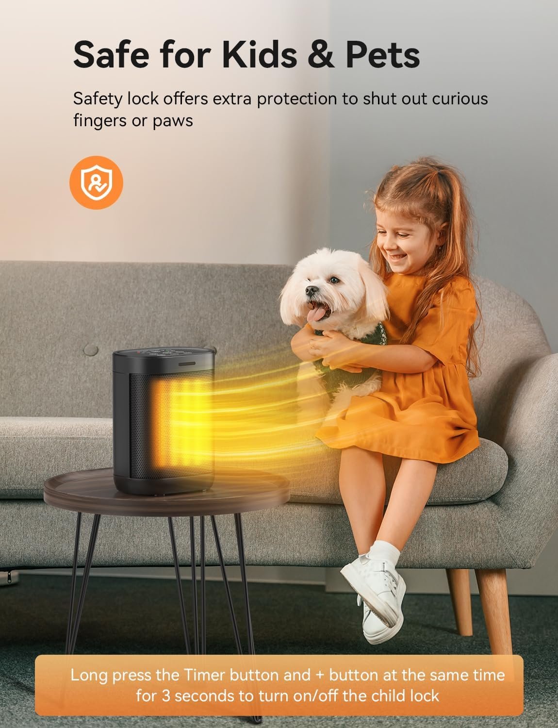 【Works Quietly】: Though small in size, this portable heater warms up the unheated home office quickly and quietly. You can sleep or work in peace. 1H to 24H timer for auto-off available, no worry about forgetting to switch off this indoor heater or risk of fire.