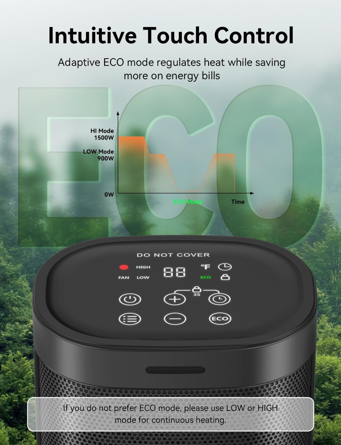 【Smart Touch Panel】: The touch panel allows you to adjust temperature, turn off/on, set time, and child lock for extra safety. Get yourself warm and toasty with High Power Mode for more intense, or ECO Mode to cut your heat bill.