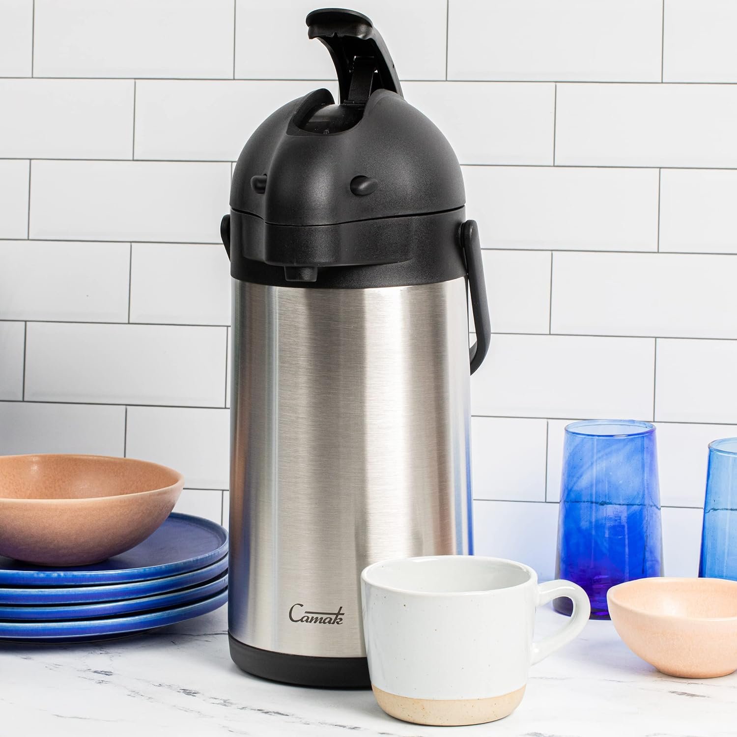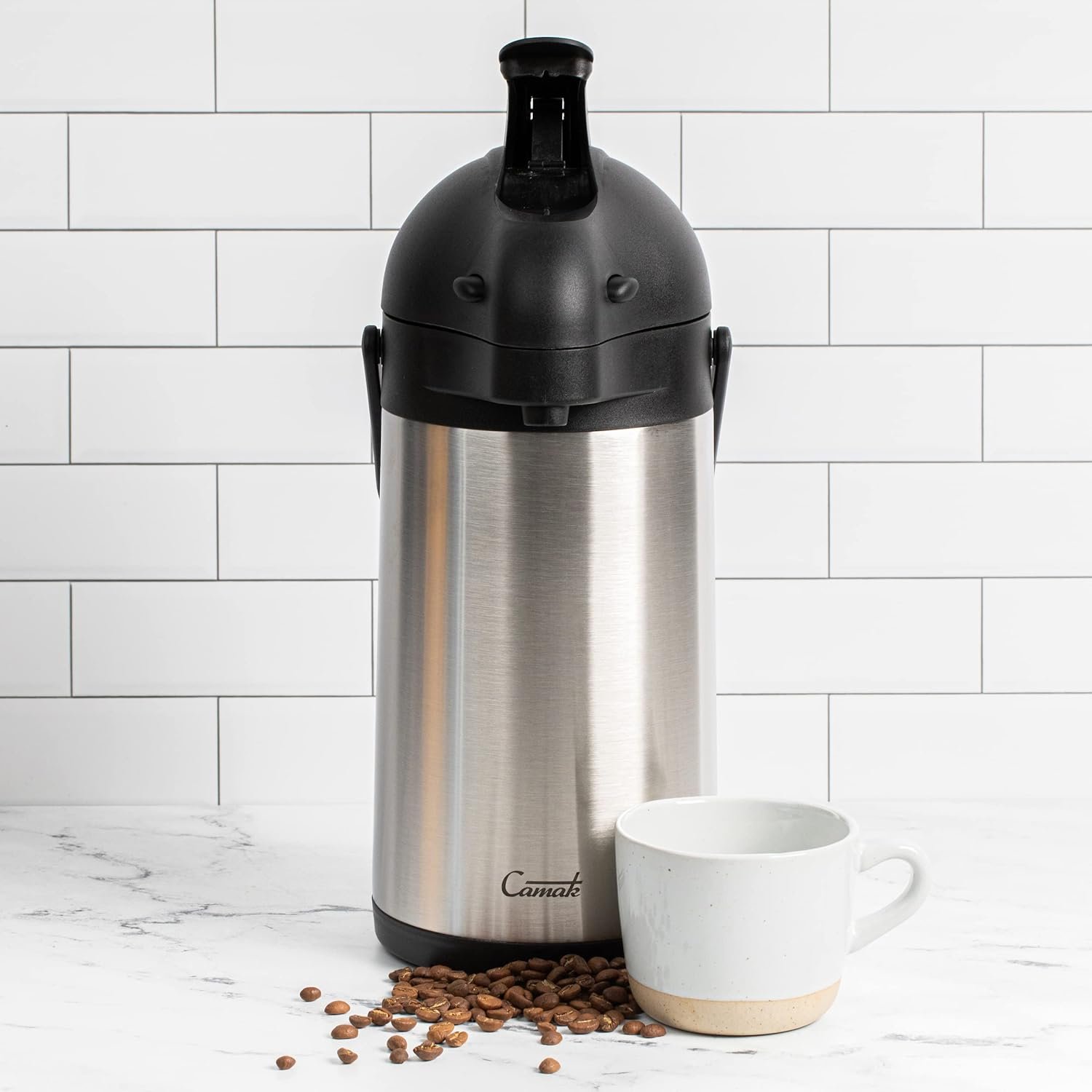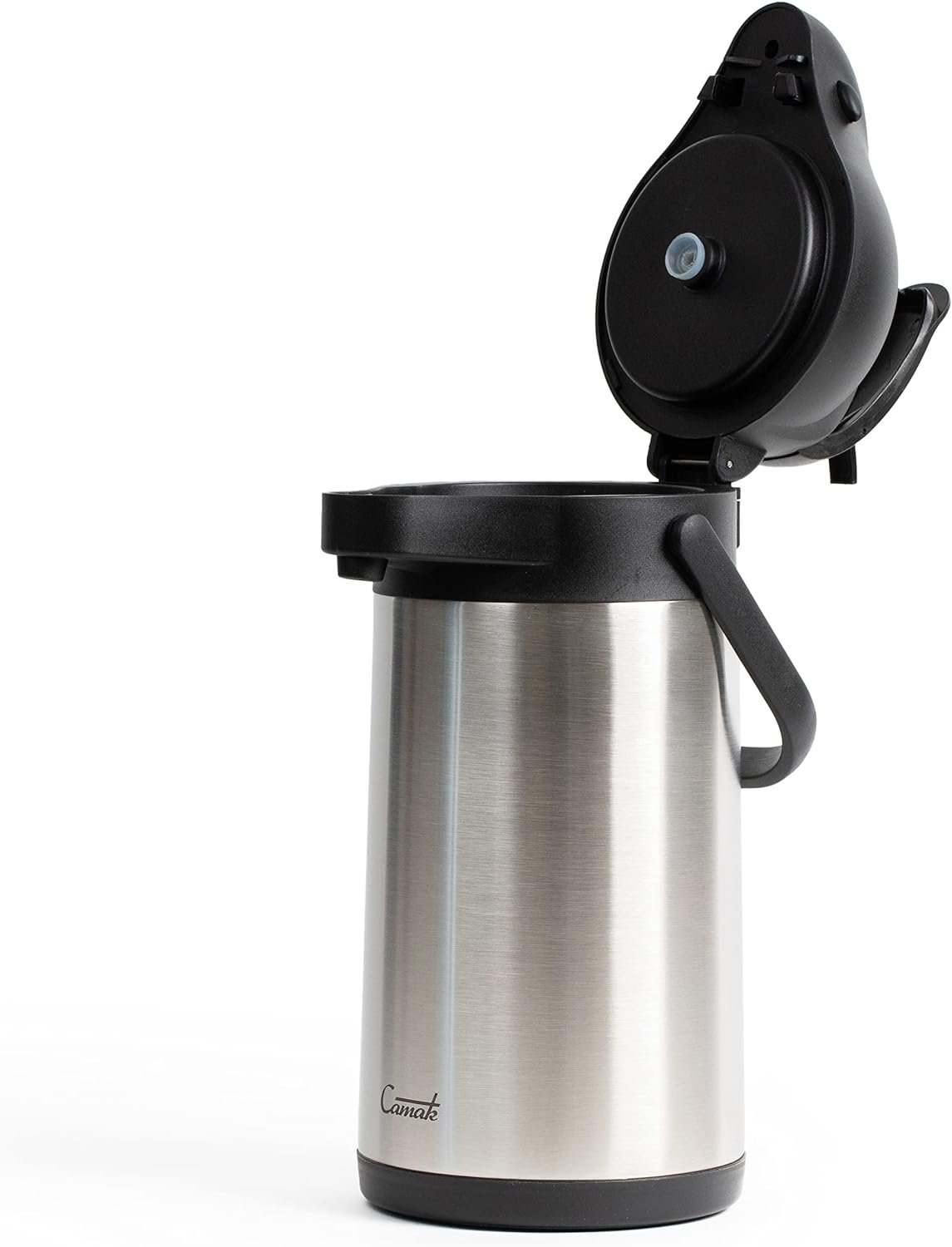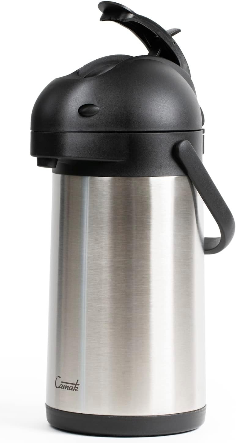 If you’re looking for a budget-friendly, reliable dispenser to serve your family or your customers perfectly warmed coffee, tea, or hot chocolate, you’ve found the perfect stainless steel airpot for you! This commercial-grade, light-duty unit is the perfect addition to offices, coffee shops, buffet tables, or a home kitchen. The vacuum-insulated stainless steel design keeps contents warm for over 12 hours. It is great for establishments that need to serve hot beverages over a long period of time, and helps to reduce waste since the beverages won’t become cold as fast. The lever on the top of the lid easily dispenses signature brews with a simple push, and it also collapses down for secure storage. When its time to fill, the push-button lid easily opens. Simply squeeze the two side buttons, flip the top upward, and set it under your coffee brewer or fill it with hot water for tea. Camak is skilled in producing only the best airpots for your beverage needs and is proudly based out of the United States of America.