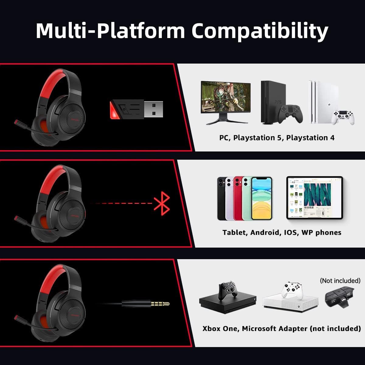 【Multi-platform Compatibility】2.4GHz dongle is compatible with PS5, PS4, PC, Laptop. Bluetooth 5.0 is compatible with Android, IOS, Cellphones. 3.5MM audio cable is compatible with Xbox One, Xbox series, PC, Laptop. 3 optional modes are compatible with most of your devices, you can use the 2.4Ghz dongle for your gaming device to play games, Bluetooth 5.0 for cellphones to listen to music, 3.5mm AUX cable for the Xbox series. Truly all-in-one gaming headphones.
