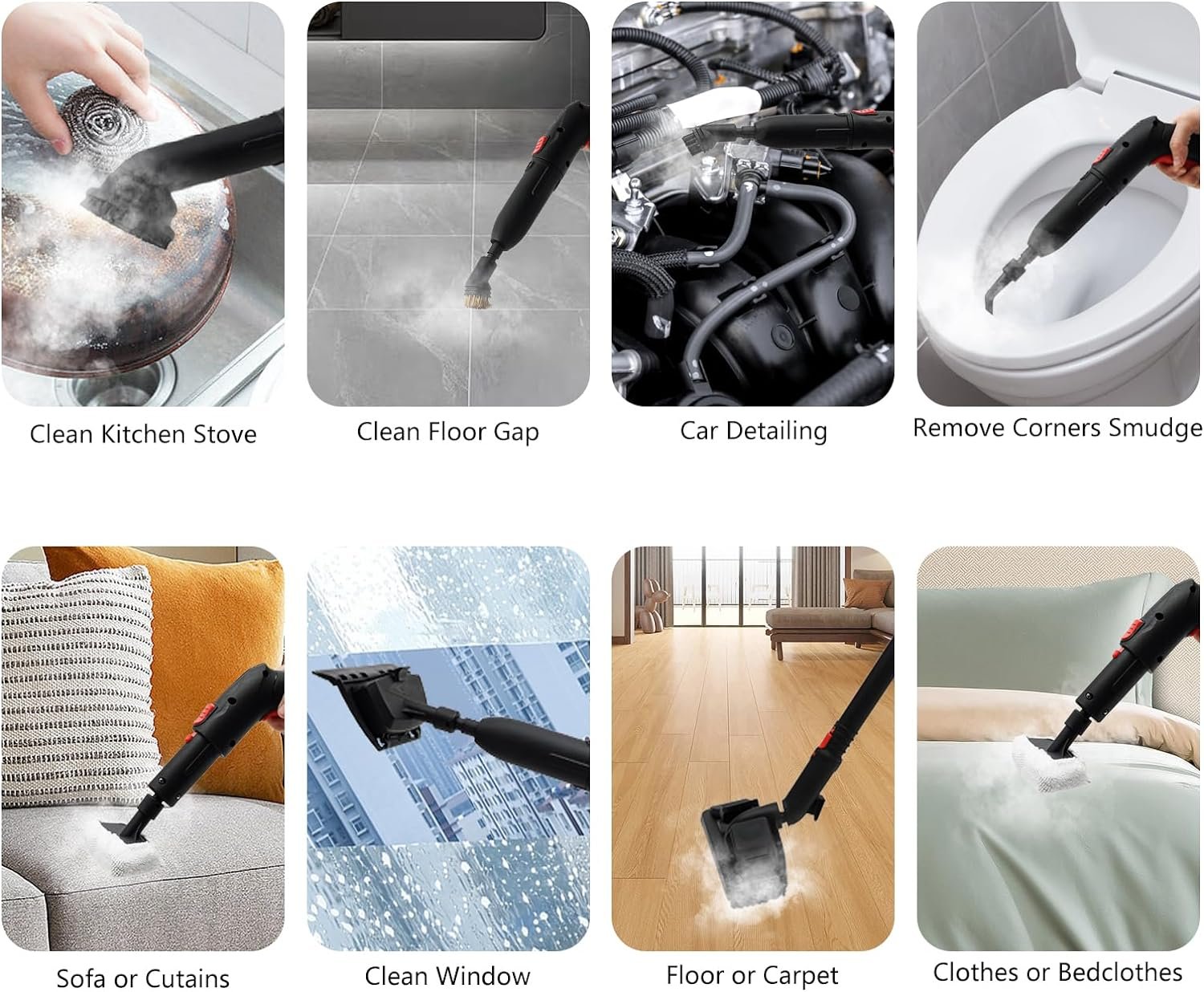 COMPLETE CONFIGURATION: Handheld Steam Cleaner for Cleaning comes with high pressure nozzle, floor brush and other complete configurations, suitable for cleaning kitchen pots/stoves, carpets, clothes, car interiors and other scenarios to meet your various cleaning needs.