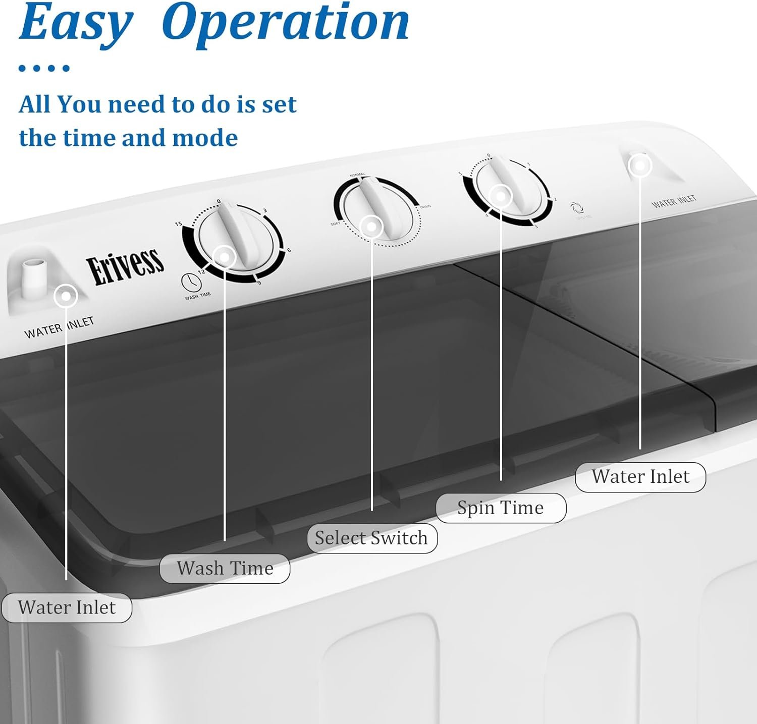 The washing cycle is up to 15 minutes, and the spinning cycle is up to 5 minutes per load, saving you valuable time as well. No installation is required, and all accessories are included, making it easy to assemble and use right away.The Erivess Portable Twin Tub Washing Machine is a great investment for anyone looking to save money on laundry while also enjoying the convenience of washing clothes at home.