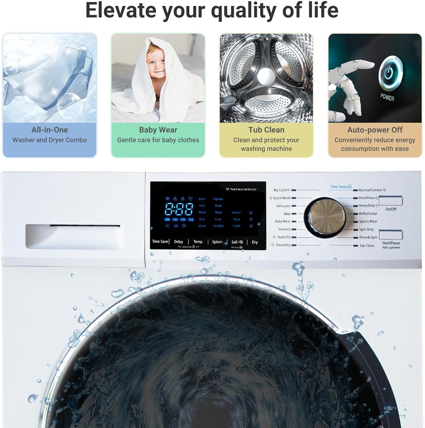 【Easy To Use】The washer and dryer combo is equipped with an LED display. you can easily choose the required wash/dry program and monitor the progress of the washing/drying cycle. With 16-cycle options, you can select the most suitable option for different types of laundry, ensuring effective cleaning and care for your clothes.