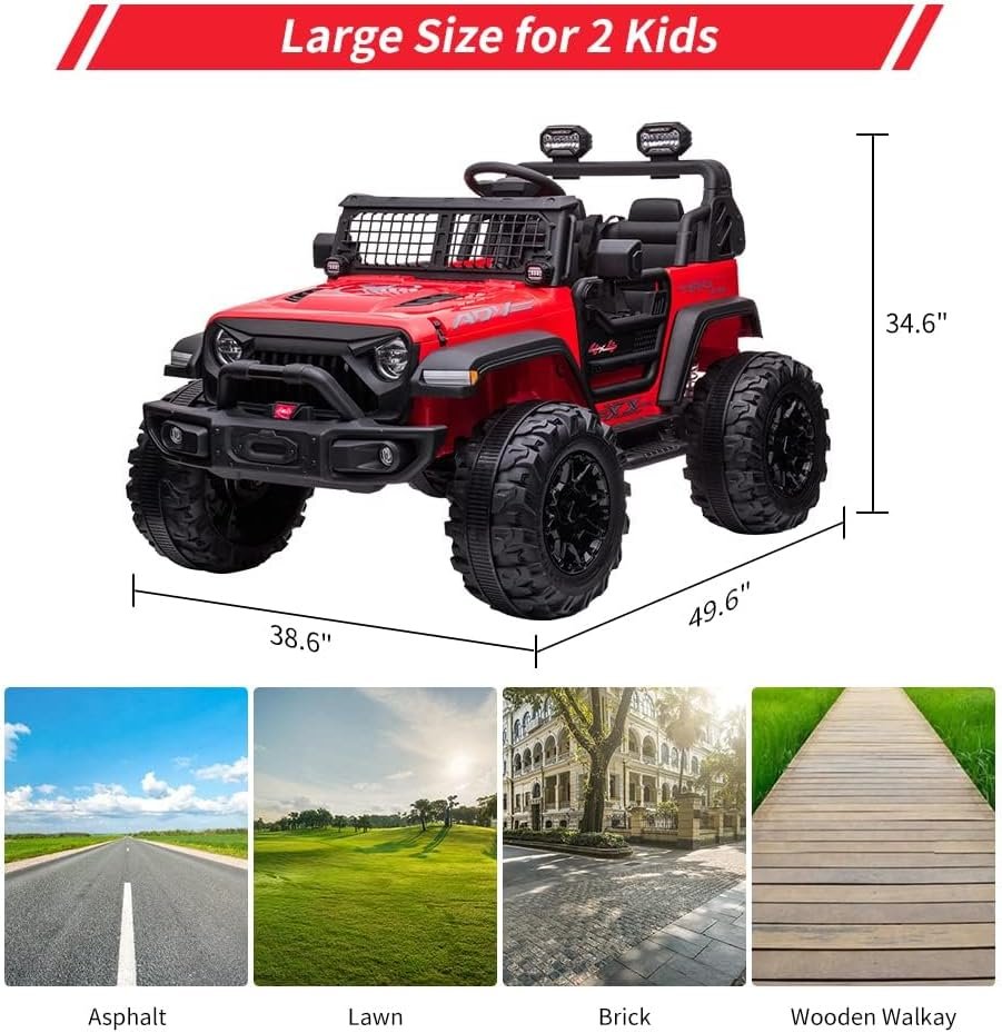 🚗Large 20″ Seat Wide–Overall size: 49.6″*38.6″*34.6″(L x W x H). Seat Width: 20″. Max Load:48KG(106LB). The large Two-Seat design can easily load 2 kids(37 months-4 years) or one 4-8 years kid to drive. 2 seats with 2 single safety belt for 1 or 2 Kids.