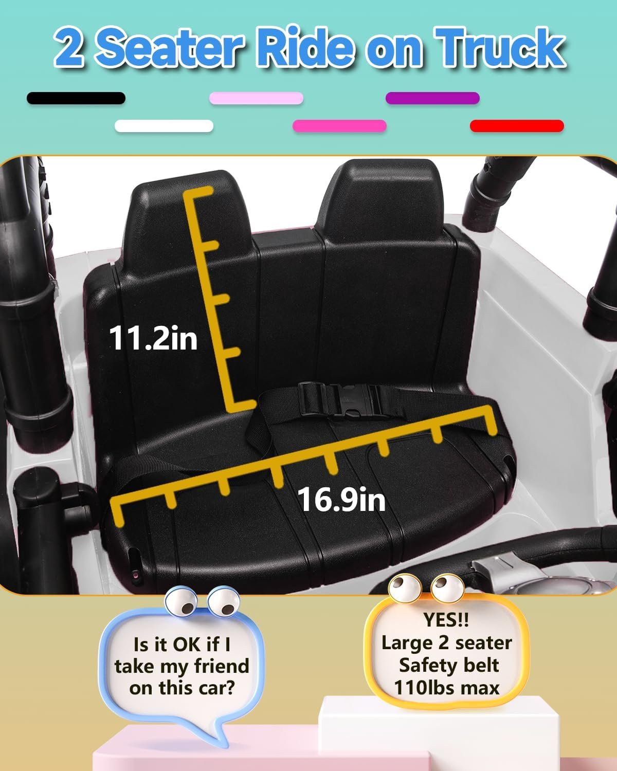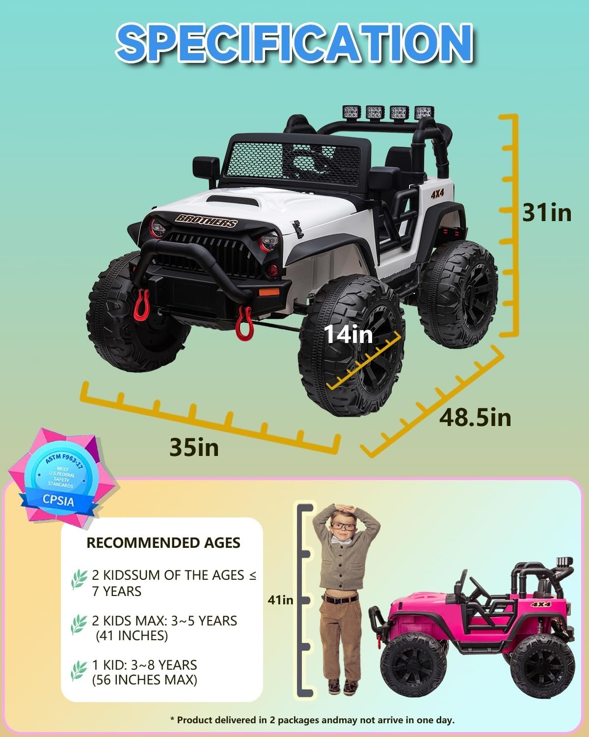 ❤️Double the Fun with 2 Seater: Our kids cars to drive feature a spacious two-seater design, making it ideal for sharing the fun with a friend or sibling! Two Seater battery powered cars perfect for 3-8 years old kid, 88lbs recommended, 110 lbs max, Car size: 48″L x 34.6″W x 31.5″H.