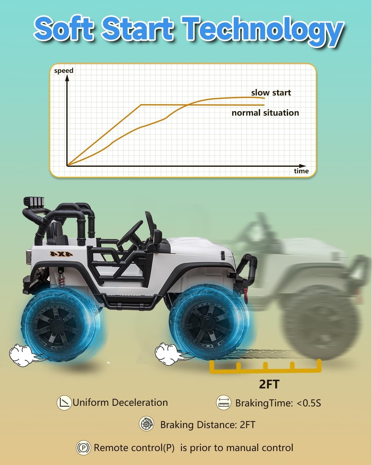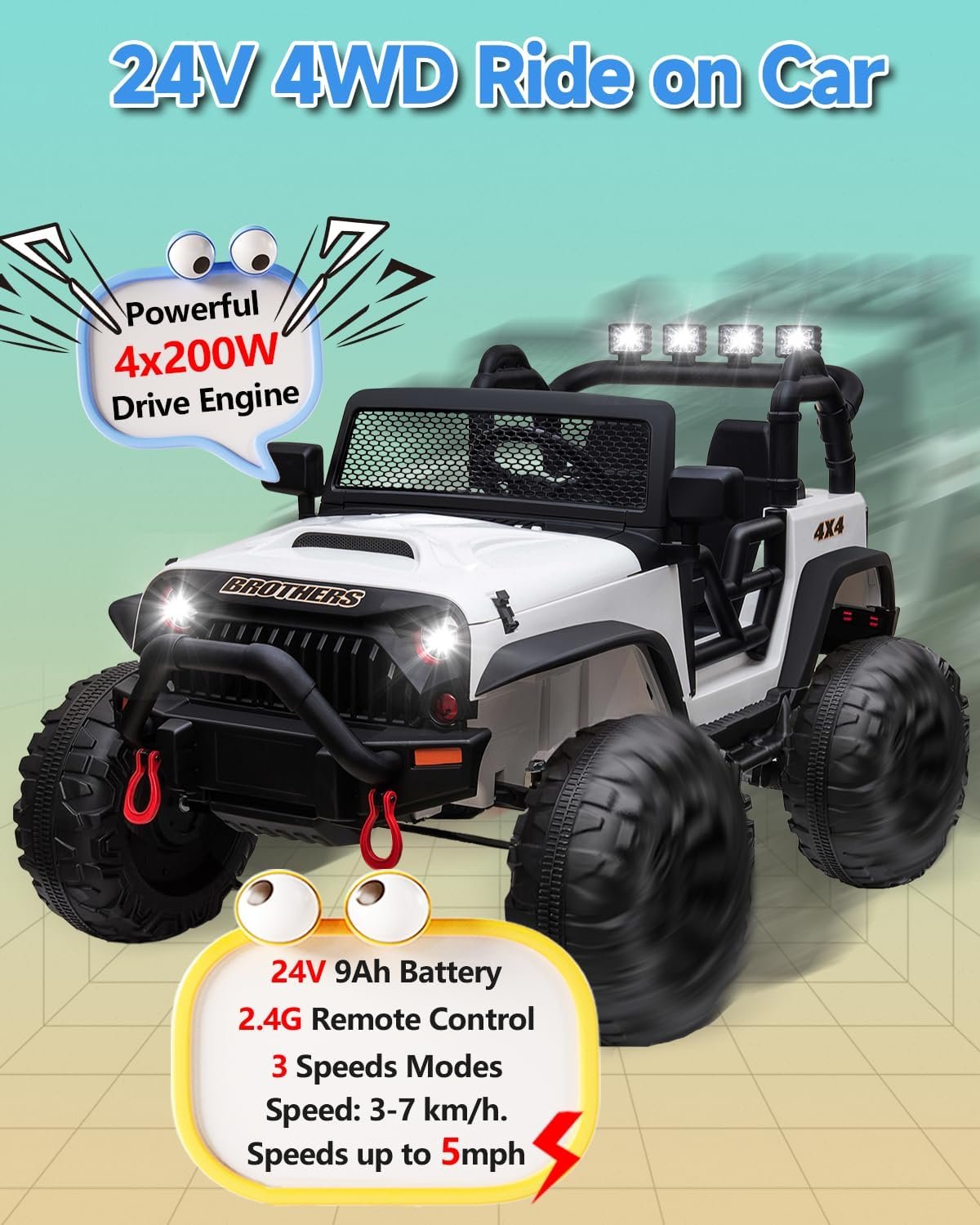 🔋Powerful 24V Ride on Adventure: battery powered cars for kids equipped with 4x200w motors, and 24V 9 AH rechargeable battery. With a charging time of 6-8 hours, this electric car ensures long-lasting entertainment. Three adjustable speeds up to 5mph, Just turn on the power, your little racer has real fast driving experience. The kids electric vehicles offers a stable start and excellent shock absorption for added safety.