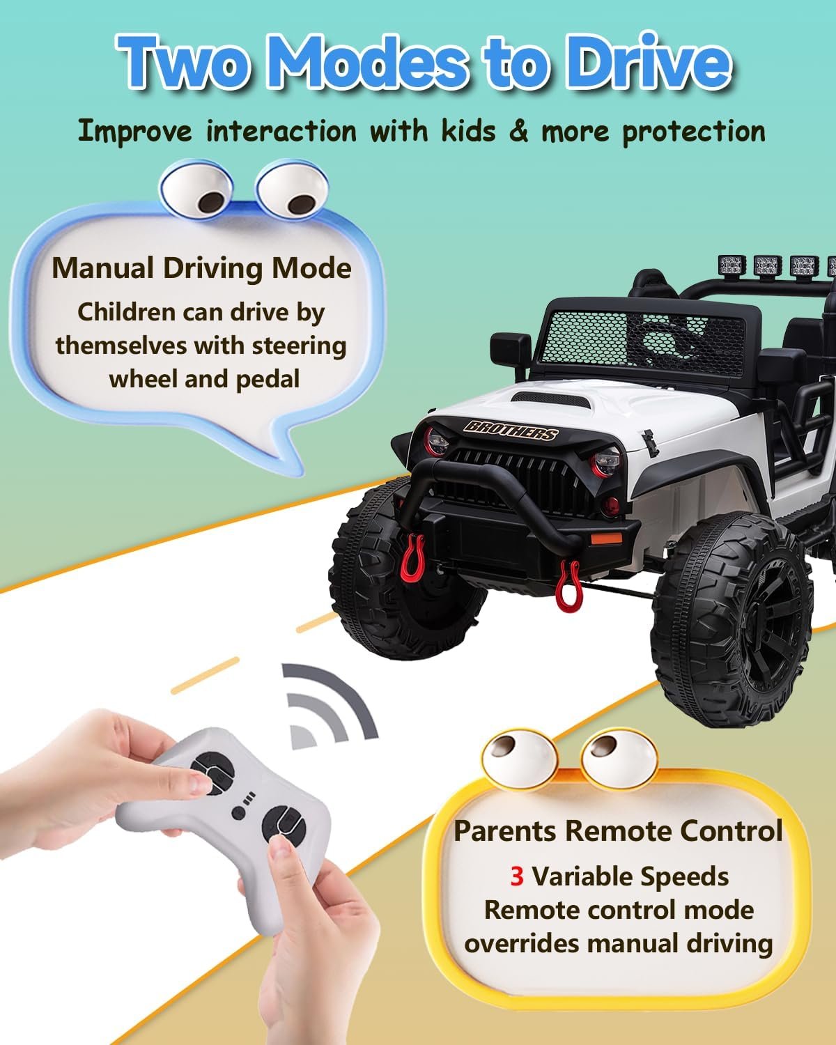 🚗Two Driving Modes for Safety and Fun: Safety meets adventure with two driving modes – manual driving and remote control. Children can freely drive this 24v ride on car using the steering wheel and pedals, enjoy a realistic driving experience; 24v power wheels also equipped with a remote control allows parents to control and avoid dangerous areas in advance, promote parent-child interaction, ensuring a secure and supervised playtime.