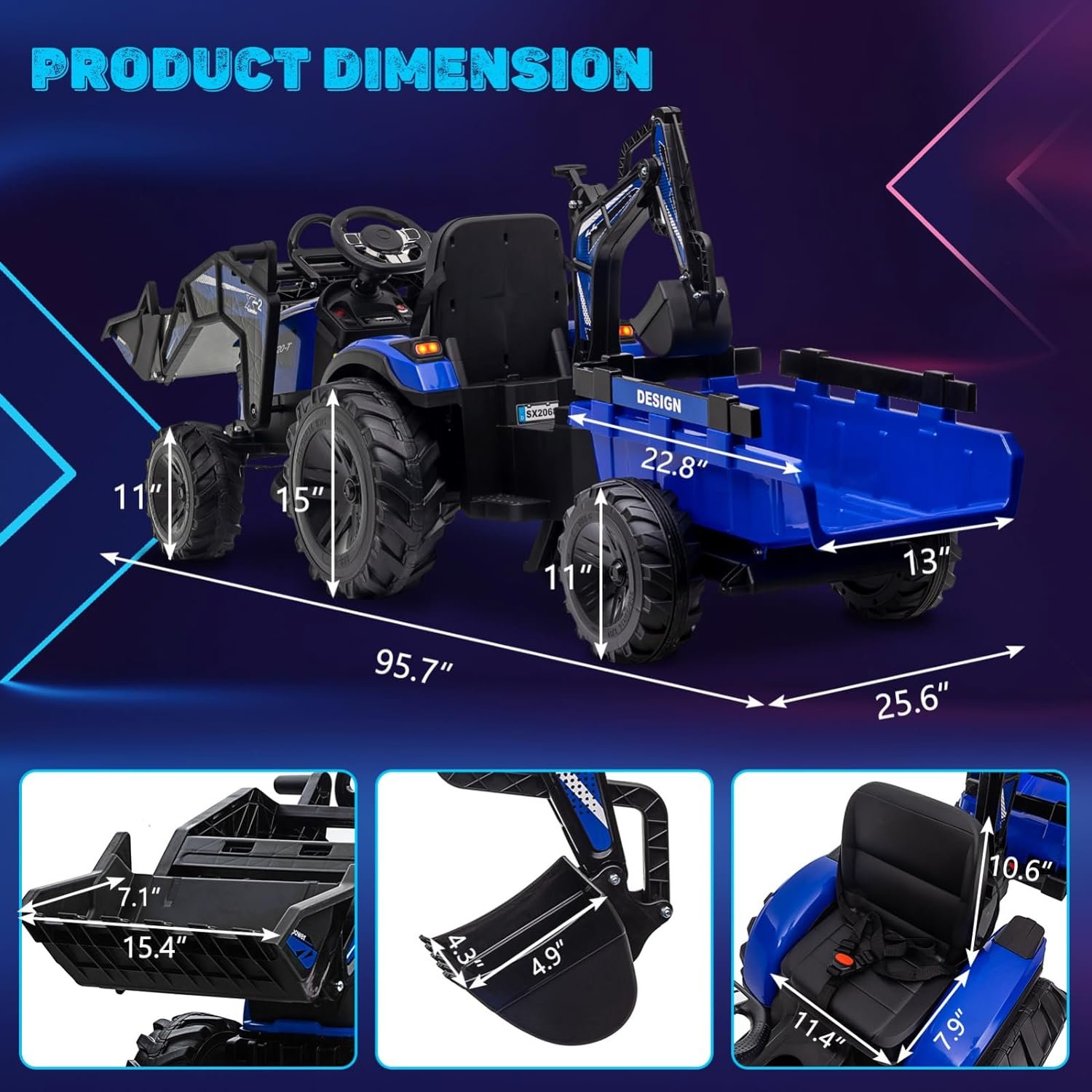 3 IN 1 DESIGN: Equipped with Trailer, Shovel Bucket, Digger, this electric tractor for kids is a perfect combination of tractor, excavator and bulldozer. Children can enjoy the fun of experiencing three different types and enjoy different riding feelings, which is an excellent play companion for kids.