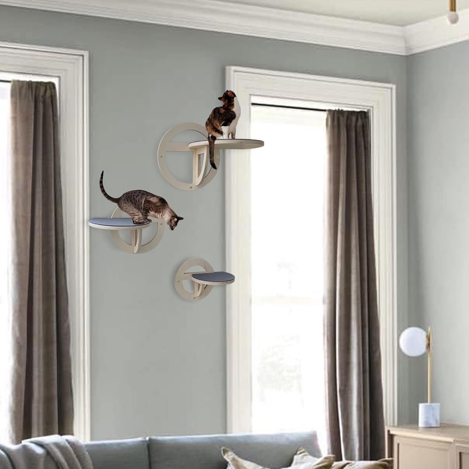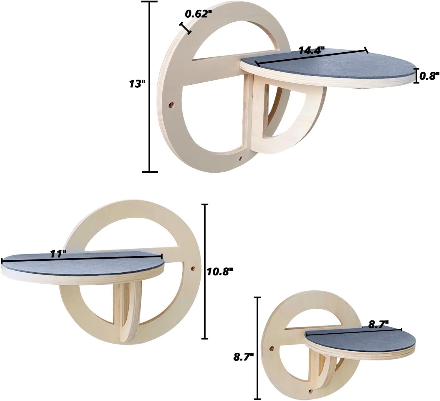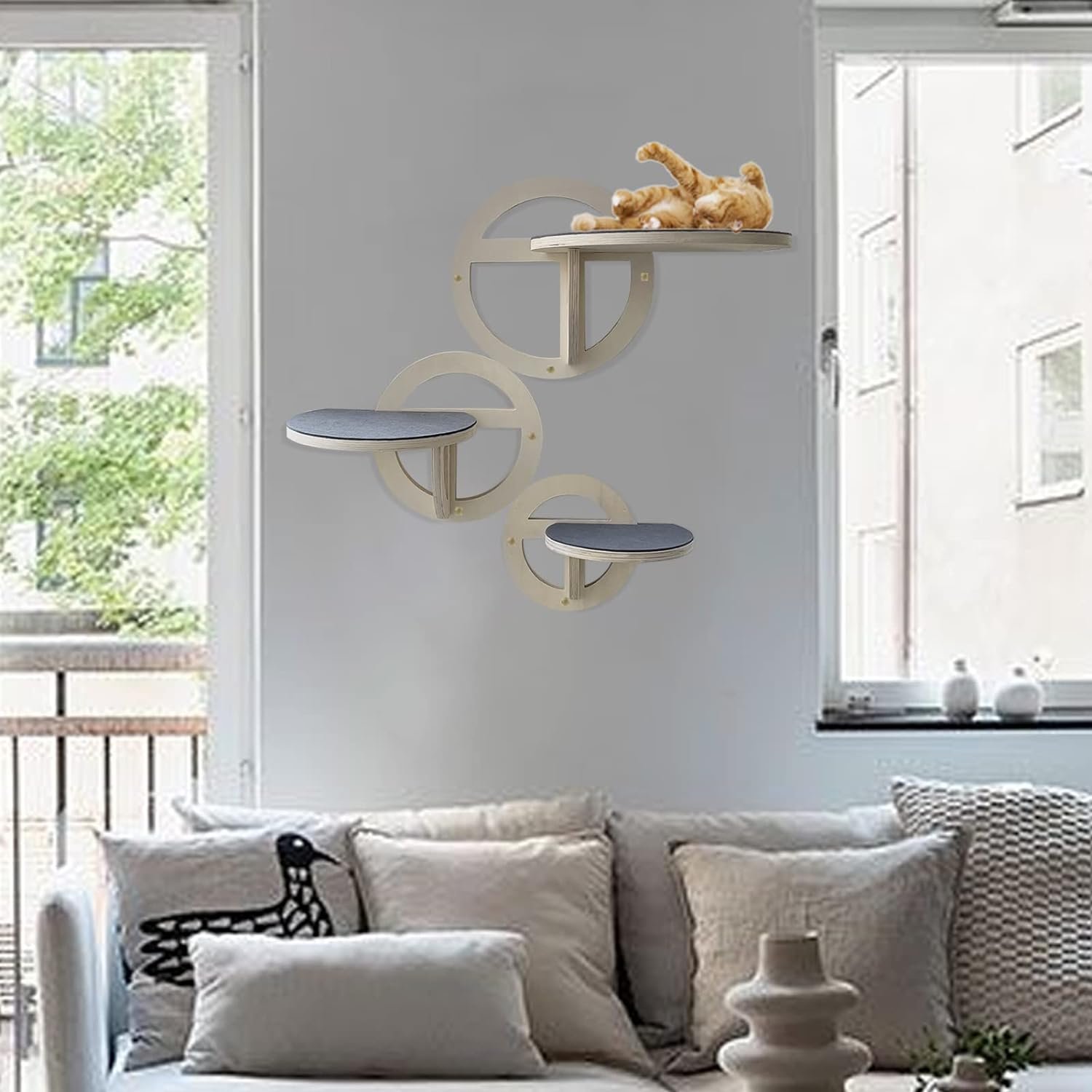 Decorative Cat Climbing Rack: Our cat hammock wall mounted contains 3 different sizes round cat platform . The cats furniture will provide comfort and a sense of security for your pet and also be an interesting wall decoration. Use your Idle wall space to create a perfect private play area for your cat’s greasy. It is very suitable for your cat, which arouses cat excitement and active state. Shelves for cats on the wall bring a relaxed and happy environment to your cat.