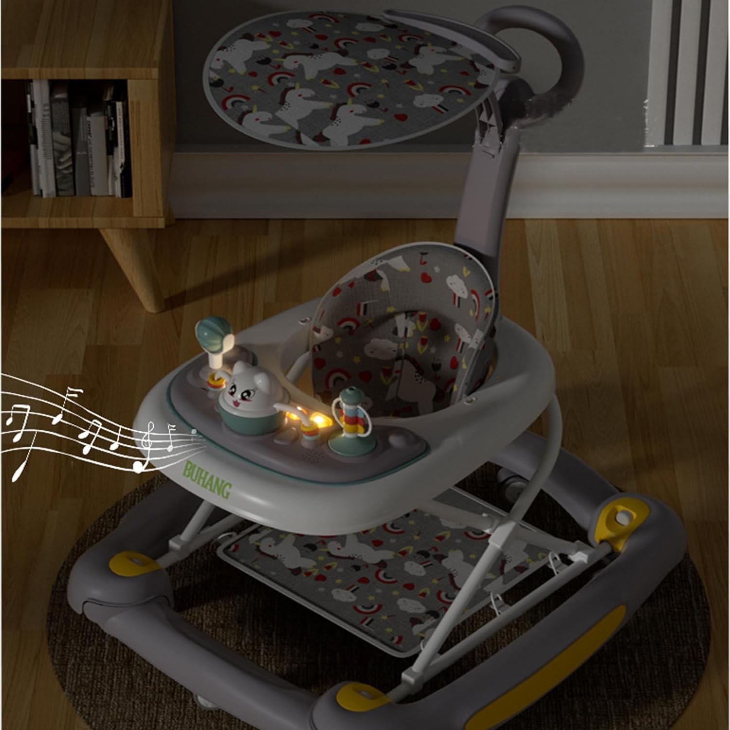 Easy to Assemble & Carry+with Sunshade:The baby walker is easy to assemble, quickly fold the walker in just a few steps. it only 8 inches tall and can be stored under bed or sofa without taking up too much space. You can keep this infant walker in the trunk for family trips or visiting friends. And baby walker comes with a sunshade and a large push handle, making it easy to carry.