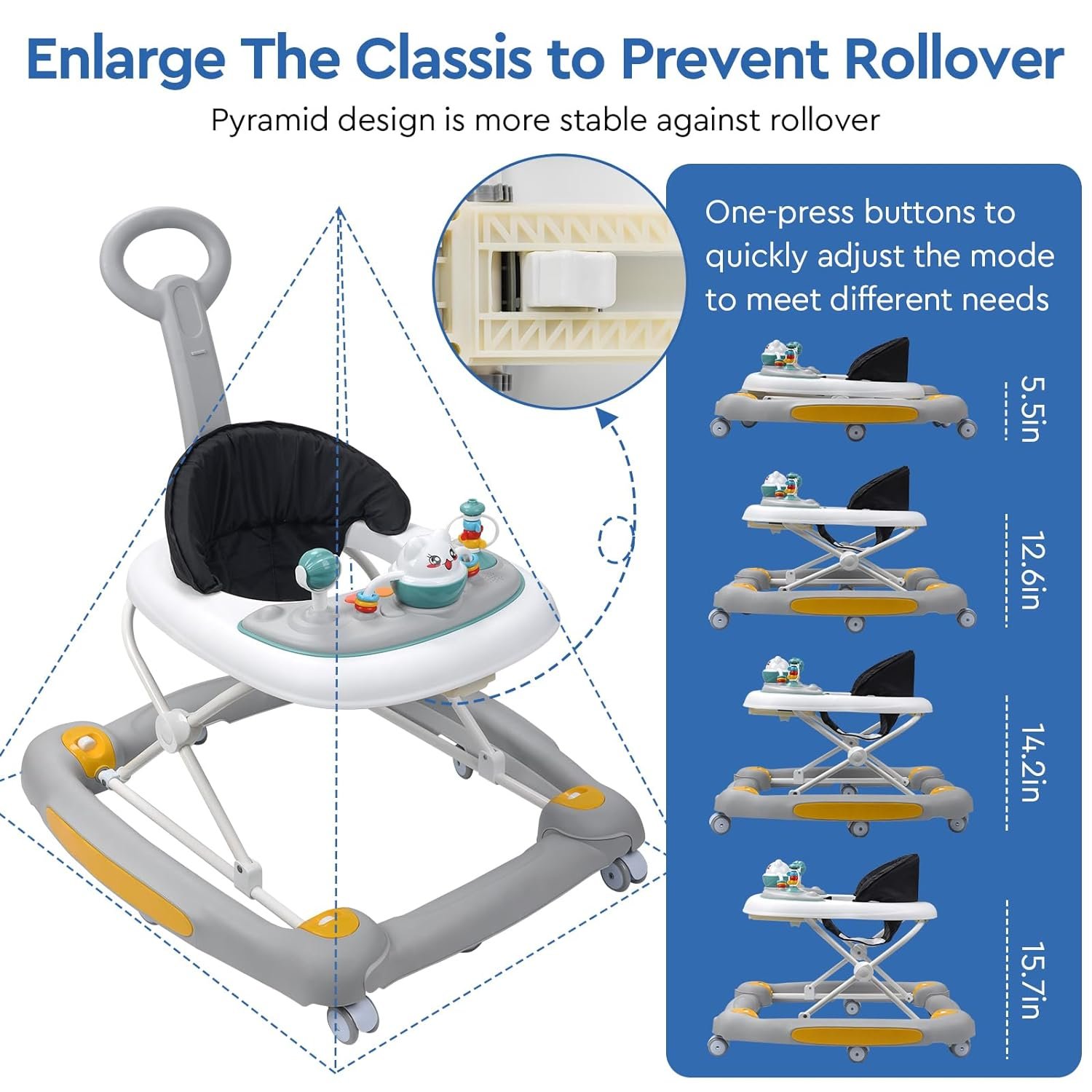 Adjustable Height Baby Walker: The baby walker has 3 height adjustable positions that allow you to easily keep your baby at the right height for different growth stages and effectively prevent O-legs. Breathable seat covers keep your baby comfortable. This adjustable baby walker is perfect for both boys and girls. Multi-functional baby walker, when you remove the toy tray, it becomes a dining table for mom to feed fruits and supplements.