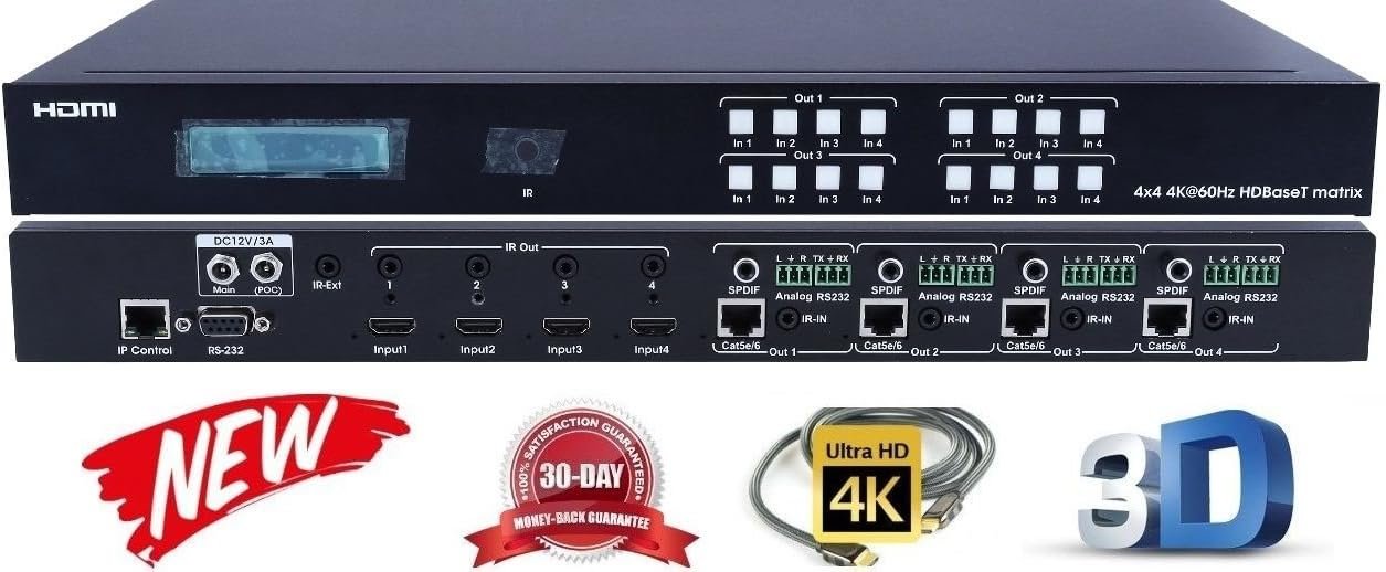 The HDBM44 is a 4K 4×4 HDBT Matrix Switcher with simultaneous optical & analog audio outputs and HDCP2.2 support! DON’T BOTHER BUYING ANY SWITCHER THAT DOESN’T SUPPORT HDCP 2.2. ALL FUTURE MEDIA REQUIRES HDCP 2.2…OTHERWISE, YOU’LL HAVE A BLANK SCREEN ON YOUR TVS. This switcher allows you to route 4 input sources (Bluray, Cable Boxes, Directv, etc) to 4 output sources (Televisions, Projectors, etc). It supports full 4K resolution and up to HDCP2.2! It comes BRAND NEW with remote control, power cable, rack ears, RS232 serial cable, and IR extender. The simultaneous optical & analog audio outputs are incredibly important and necessary! Let’s say you have 4 Apple TVs going to 4 different Televisions. Additionally, you have multi-channel amplifiers powering ceiling speakers for each of the televisions. Apple TVs don’t have optical outputs anymore…only HDMI outputs. So with this matrix, you would simply plug the Apple TV HDMI outputs into the 8 HDMI inputs. And then connect the simultaneous optical audio outputs to your multi-channel amplifier…quick and easy! This setup would be much more difficult with other HDMI matrix units with no optical audio outputs. You would need to buy a bunch of HDMI to optical audio adapters, as well as many more cables….it would be a mess! Also, no other HDMI matrix has as many convenient control methods as mine does. RS232 software and web browsing control is ready out of the box! The HDBM44 is guaranteed to perform just as well, or better, than any other matrix in the market. Even those that sell for $5,000 or more! Don’t be fooled by the AV industry! There is no need to overpay for the latest technologies!