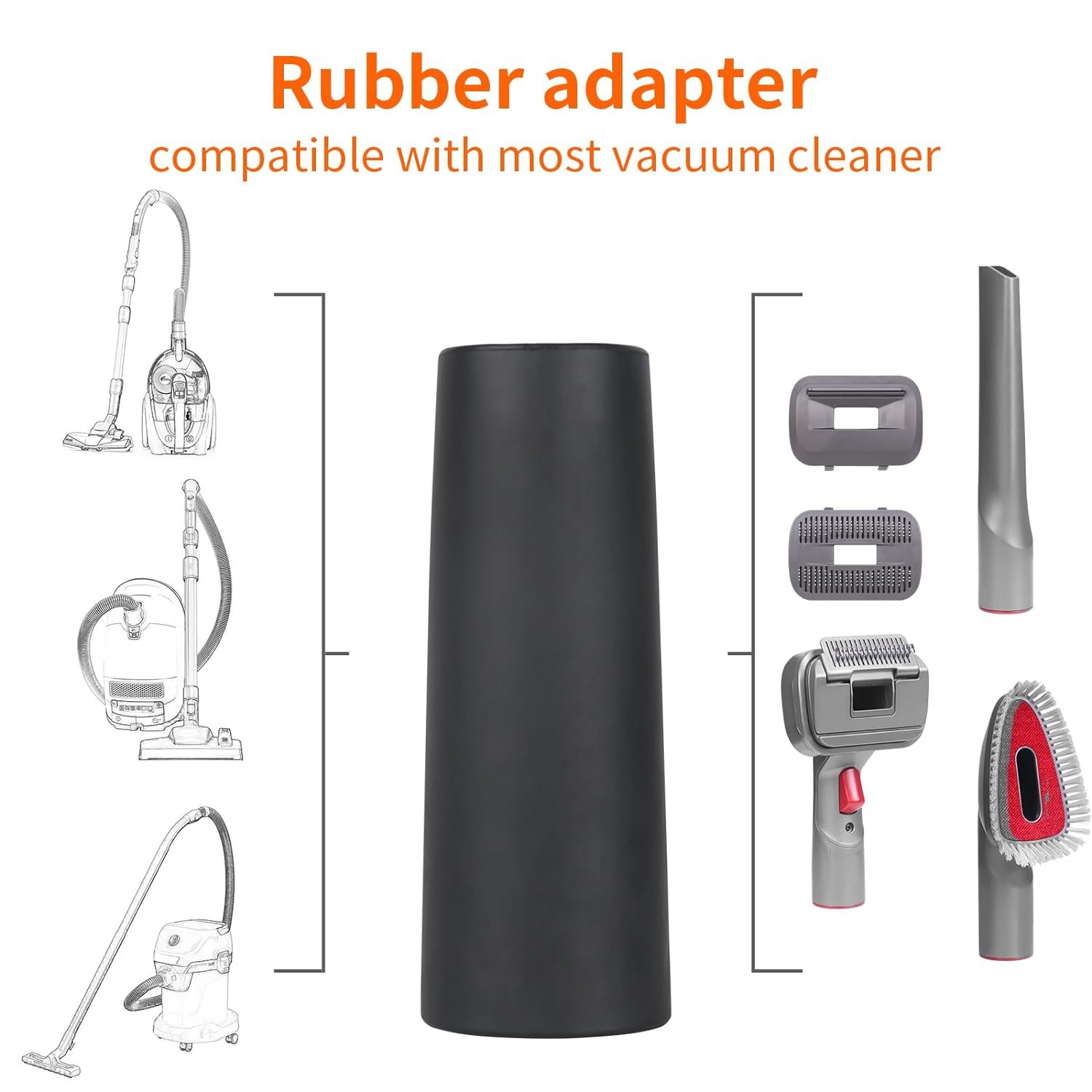 【Wide Compatibility】This dog brush vacuum kit is nearly universal. It can be connected to Dyson V7, V8, V10, V11 and V15 directly. For other brands, please make sure the outer diameter of your vacuum connecting hose cuff or wand is no more than 2 inches but bigger than 1 ¼ inches. Their shape needs to be round or nearly round. Use the black adapter when connecting to common central or canister vacuum cleaners if necessary.
