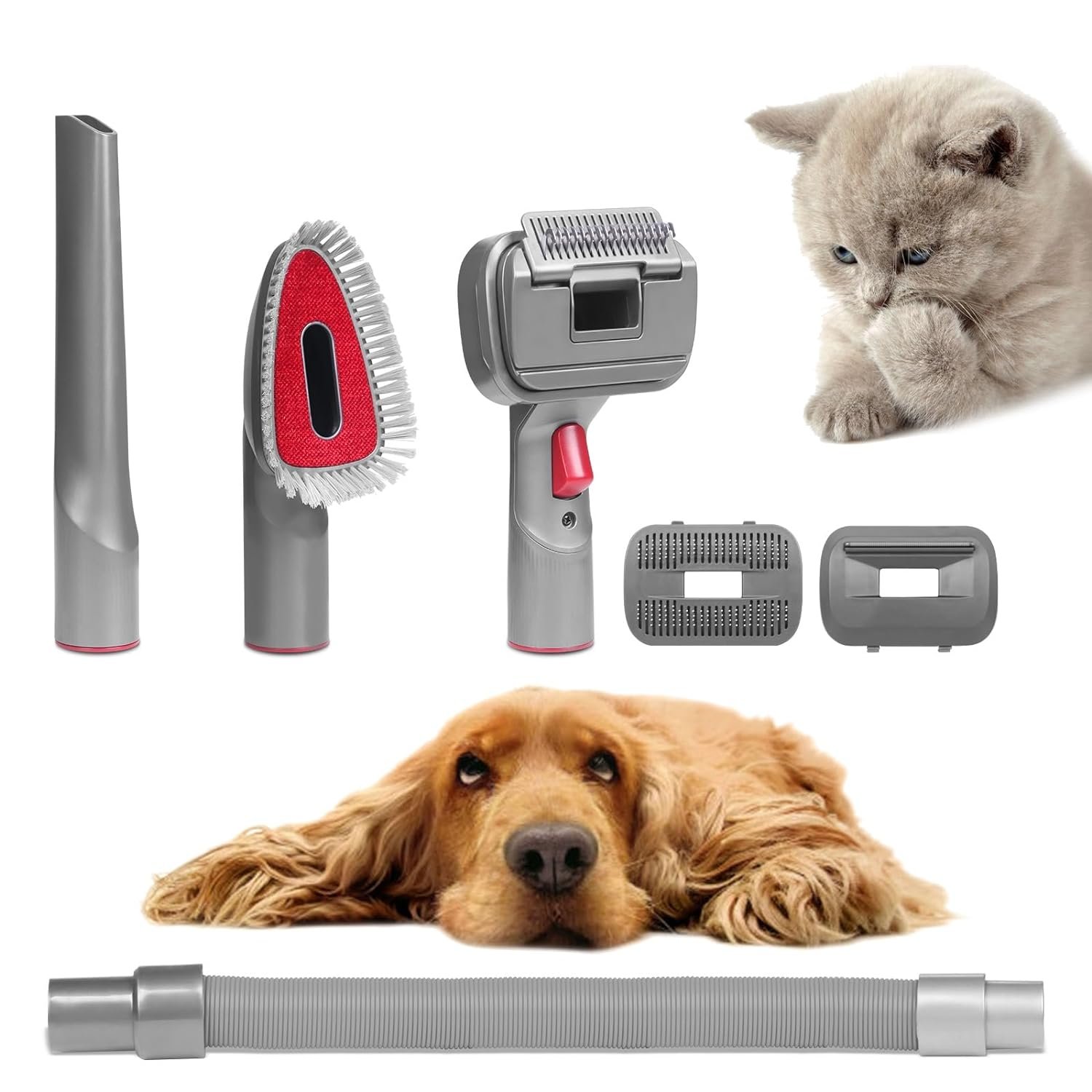 【What’s included】 VACUUM CLEANER IS NOT INCLUDED!!! The set includes: 1* slicker brush; 1* deshedding brush; 1* dematting brush; 1* crevice tool; 1* sofa brush; 1* extension hose; 1*black adapter; 1*trigger lock . The extension hose can be extended to 55 in (140cm), you can keep your vacuum tucked away from your pet, reducing their stress and skittishness.