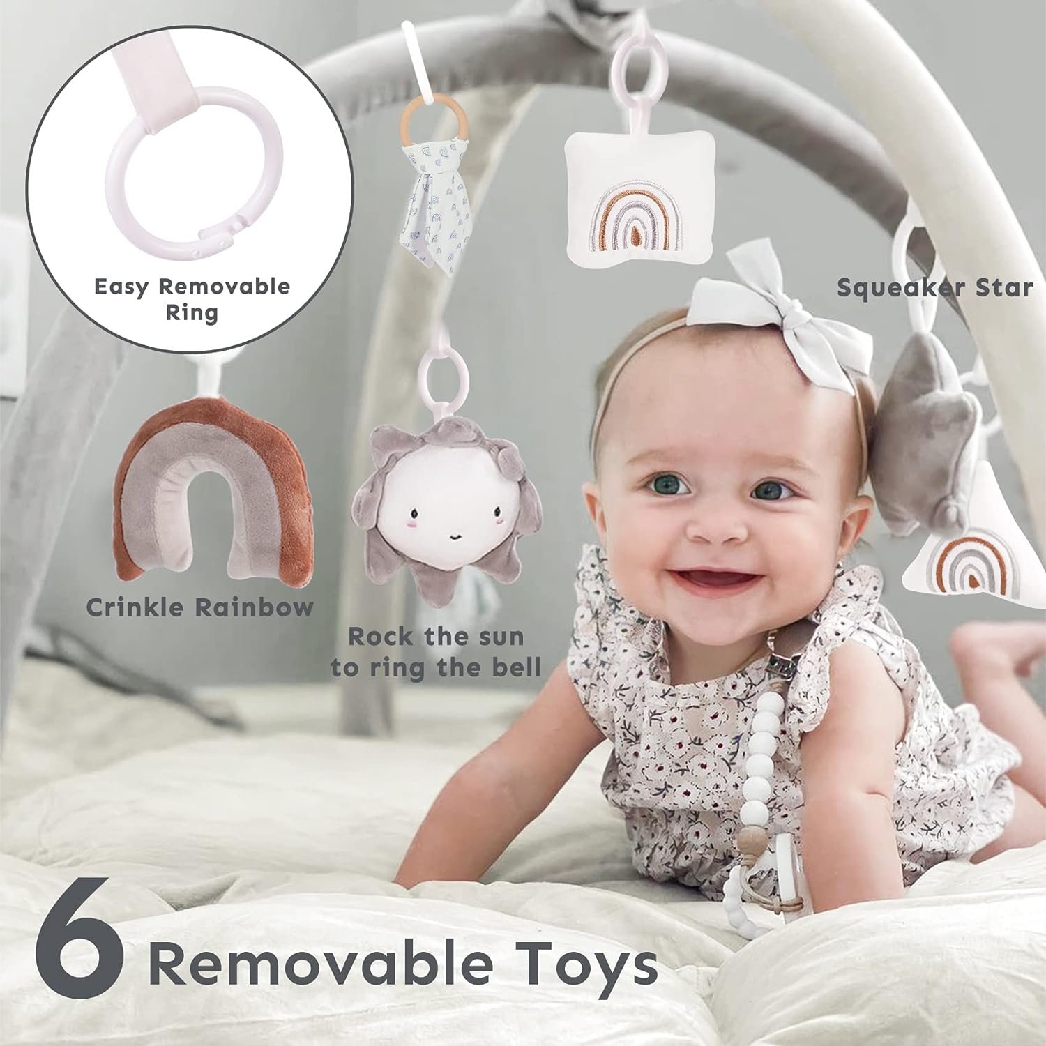 SPACIOUS & THOUGHTFUL DESIGN: Our large and cozy tummy time mat offers an ample play area for your baby to explore, stretch, sit, or crawl. The mat is constructed from premium cotton, guaranteeing both durability and comfort. Additionally, it comes with 6 detachable sensory toys, including crinkle fabric, bells, and squeakers, providing endless engagement and developmental opportunities.