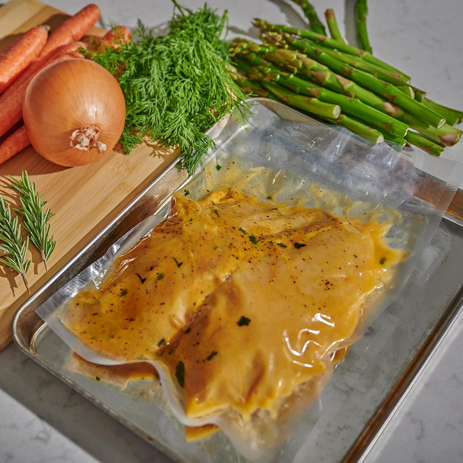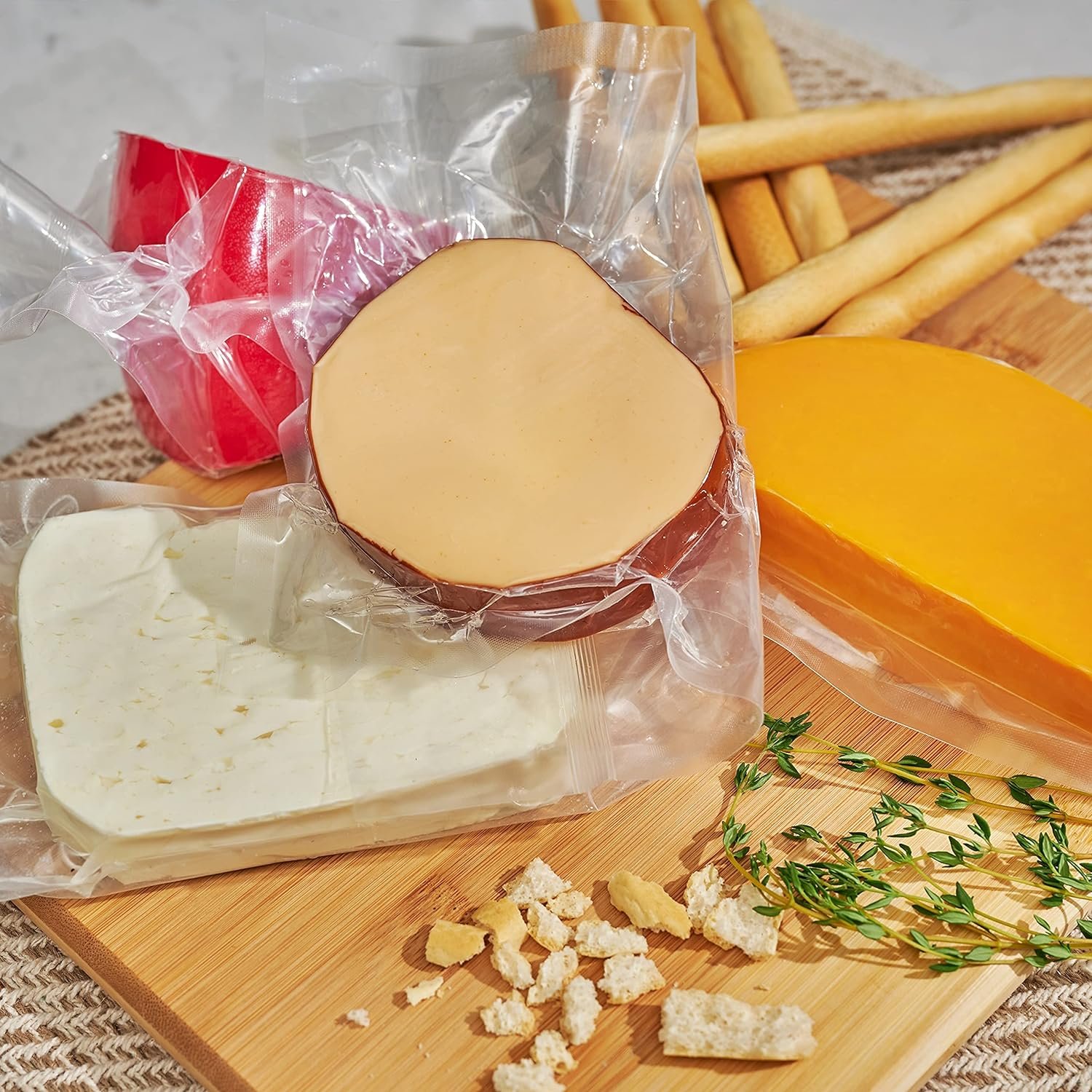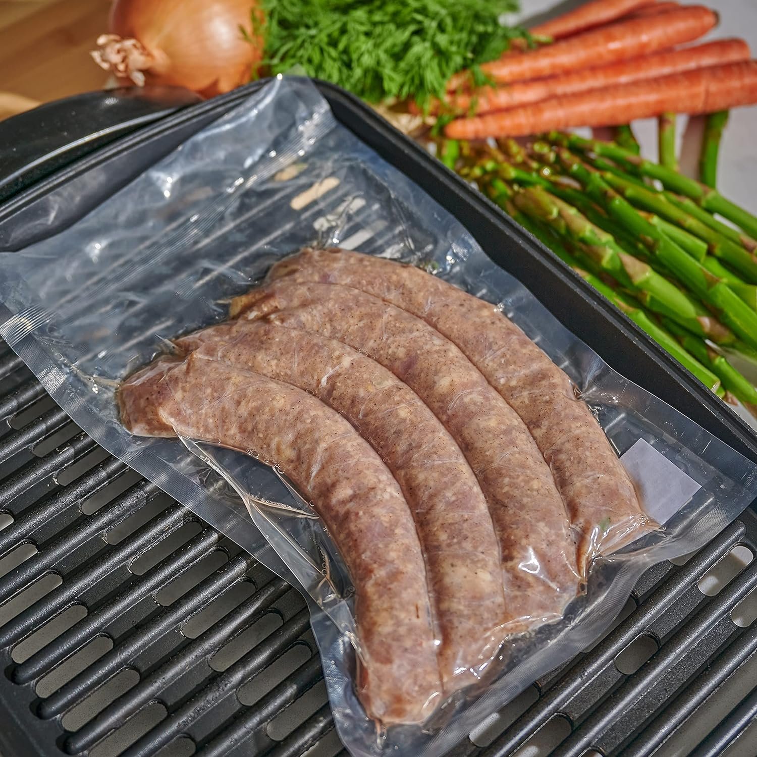 VACUUM CHAMBER BAGS MATERIAL: Blend of polyamide/polyethylene high barrier, high clarity film extends shelf life and helps prevent freezer burn and dehydration.