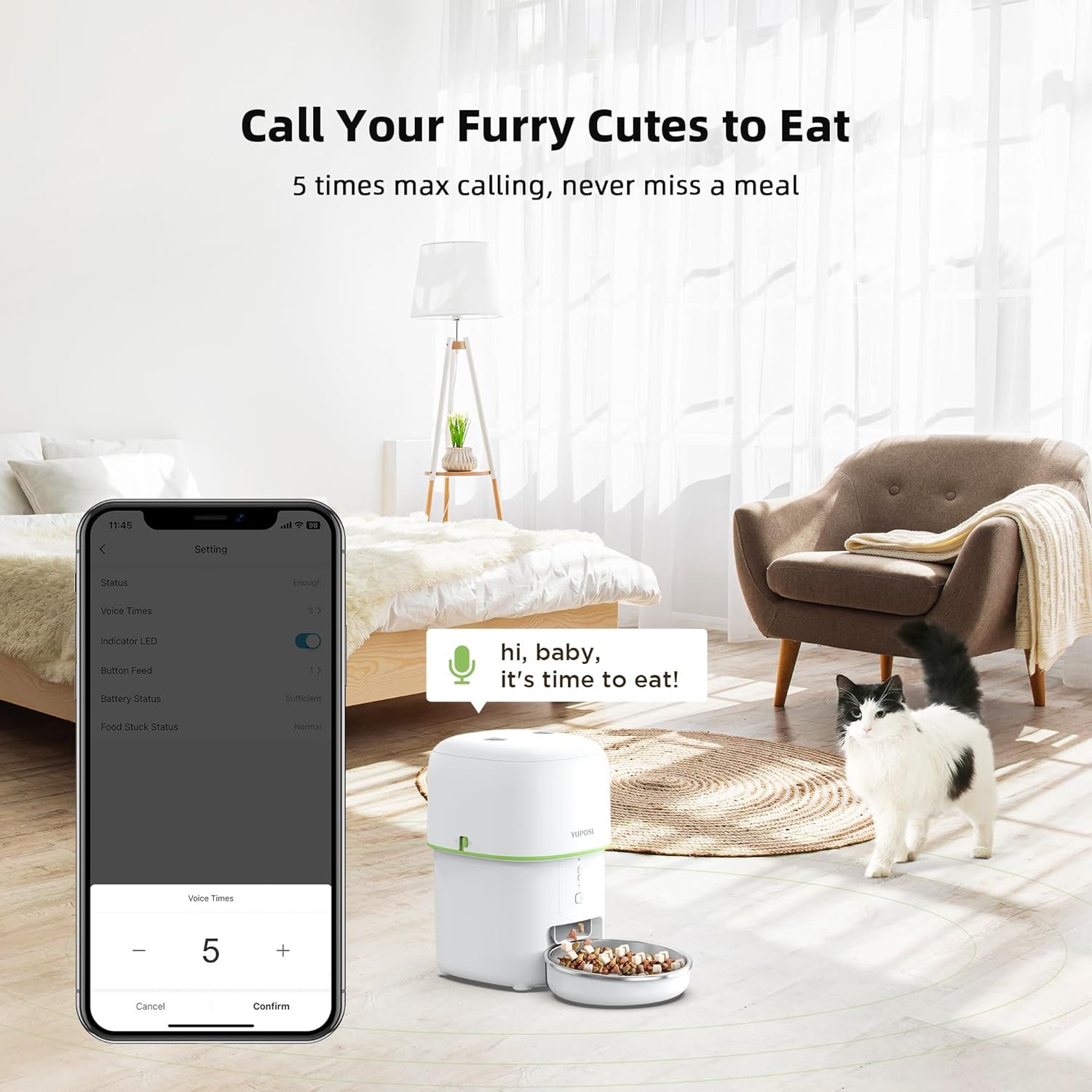 Built-in Recording Function: Yuposl’s automatic dog feeder supports 10-second voice recordings. Each feeding program can include up to 5 recordings, ensuring your voice is always there to accompany your pet even when you’re not at home.