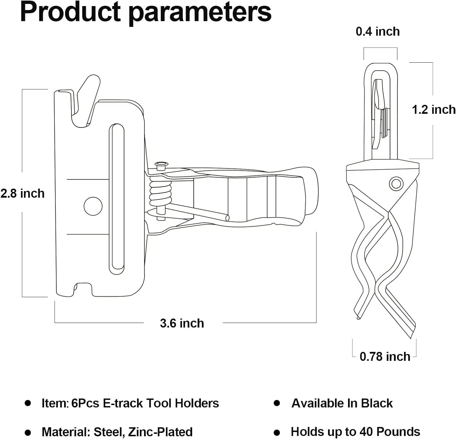🧰【Dimensions】- The E track tool hanger set includes 6 E-track tool organizers and a height of 2.8″. Each etrack tool holder is 0.78″ wide 3.6″ from front to back, see the mechanical sketch image for a visual guide. Maximum Opening Size 1.78″. Holds Up to 40 Pounds.