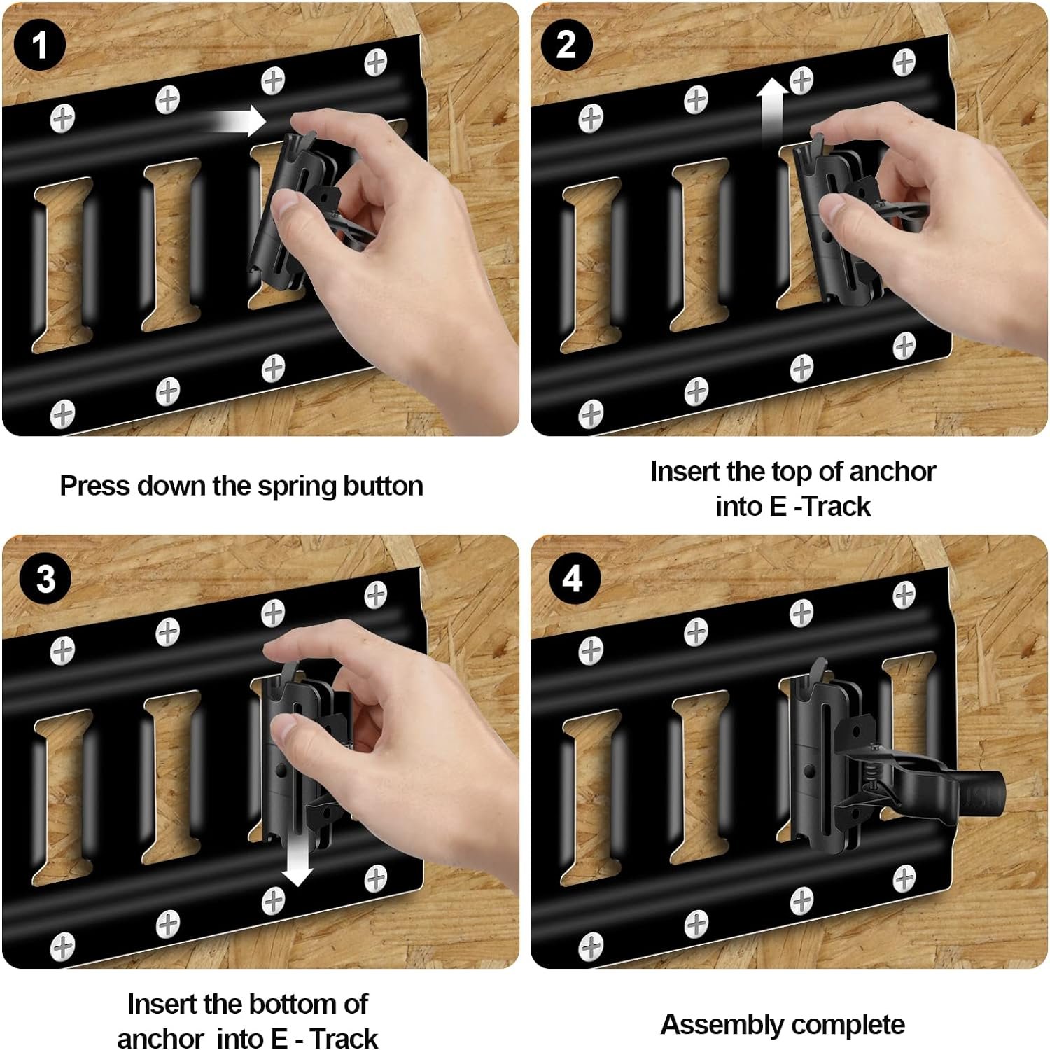 🧰【Easy to Use】- These e track tool stabilizers with Etrack spring fitting attachments that make you can install easily and quickly. Just snap them into the anchor points of E-track, X-track or e track single slots, you can keep it fixed against the wall in your garages, warehouses, enclosed trailers, trucks or vans.