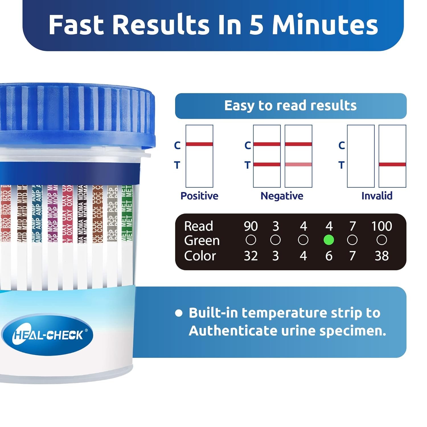 The Heal-Check 12 Panel Test Kits provide easy to interpret results, under a peel-away label that protects the individual’s privacy, and equipped with built-in temperature strips to ensure fresh sample.