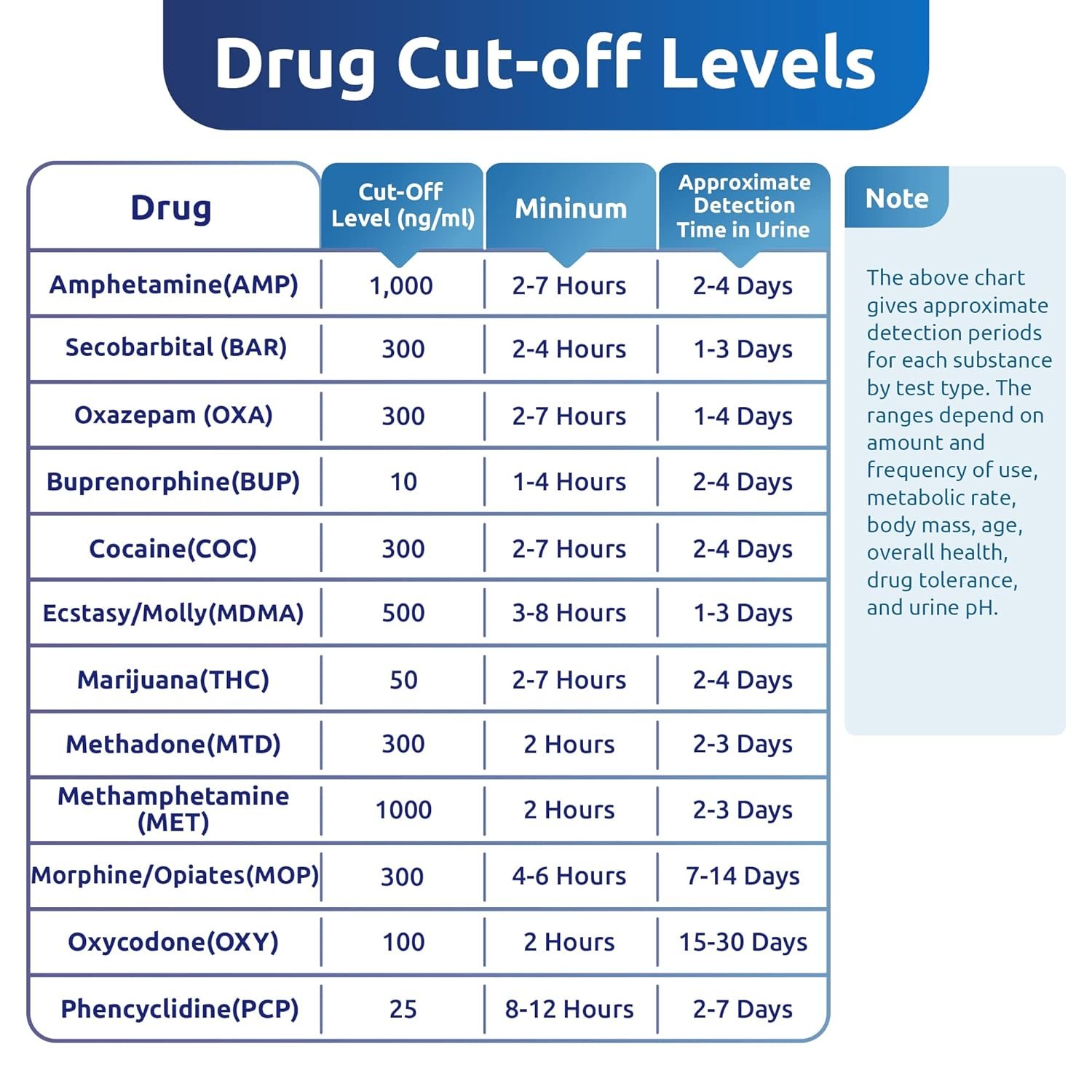 12-in-1 Drug Test Cup: Accurately detects 12 specific drugs with listed cut-off levels.