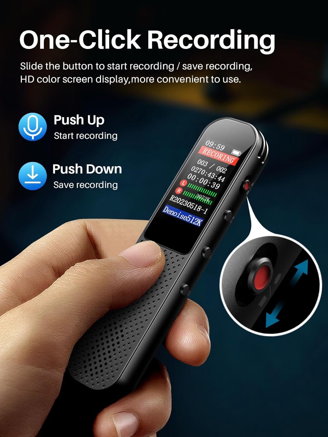 【Simple Operation & Local Playback】 Slide the button to start recording/save recording. After starting up, you can quickly record without missing the moment you want to record.Equipped with 0.96 inch high definition color display,the screen is clear and beautiful, making the operation more convenient,and the built-in speaker can play the recording directly. (The effect will be better with headphones.)