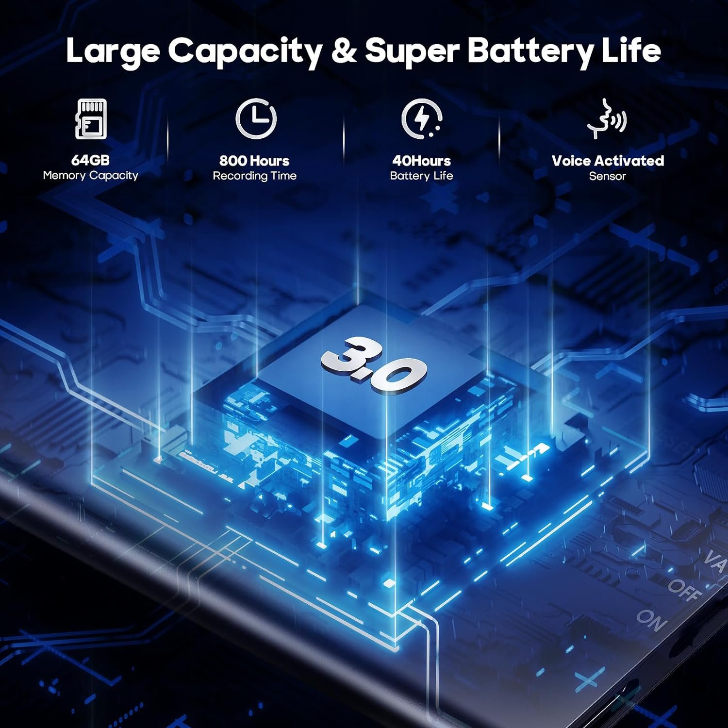 🔊【New Smart Upgrade】The recorder offers you 64GB super storage space, 40 hours of battery life and 800 hours of recording capacity. When the battery power is very low, the recording will be saved automatically.