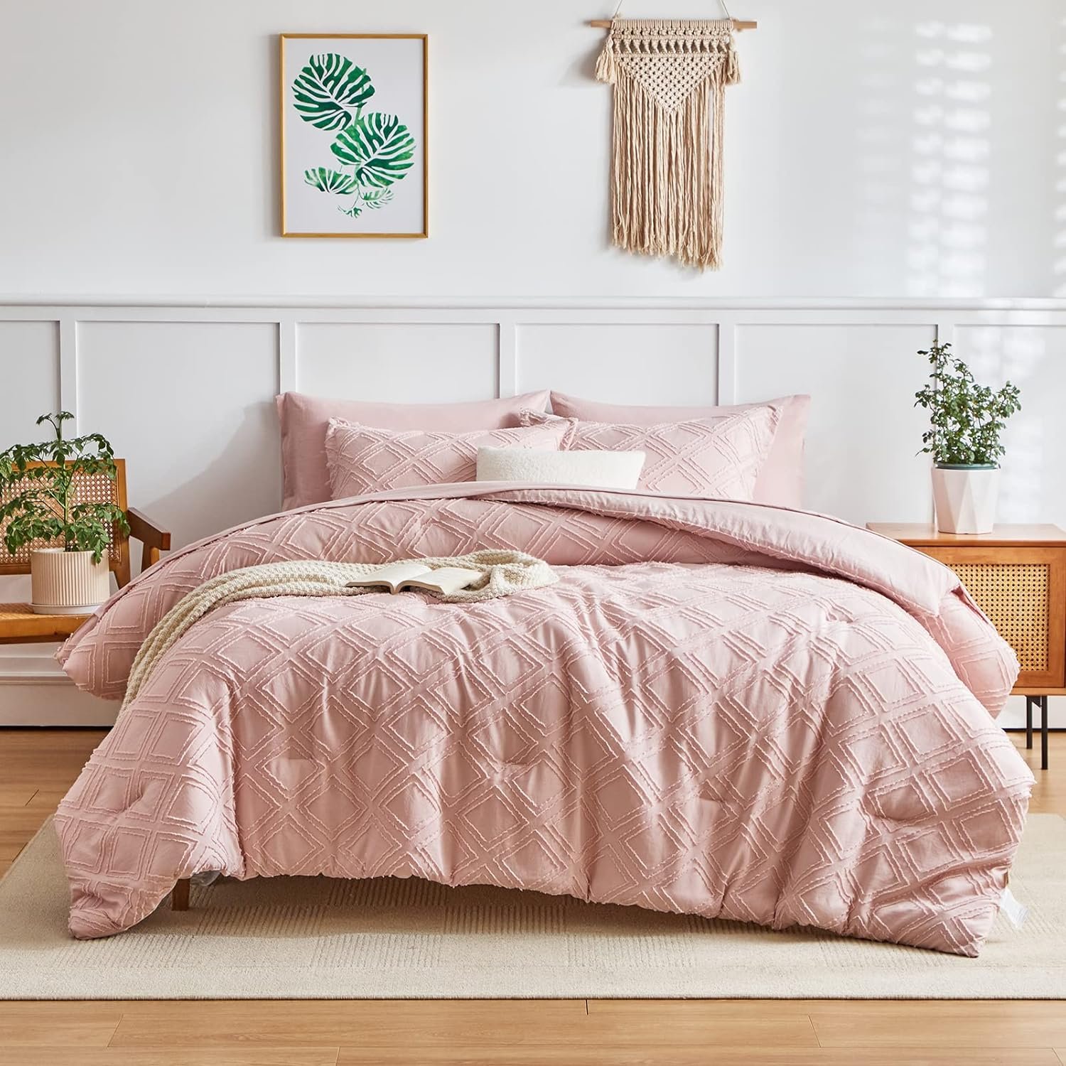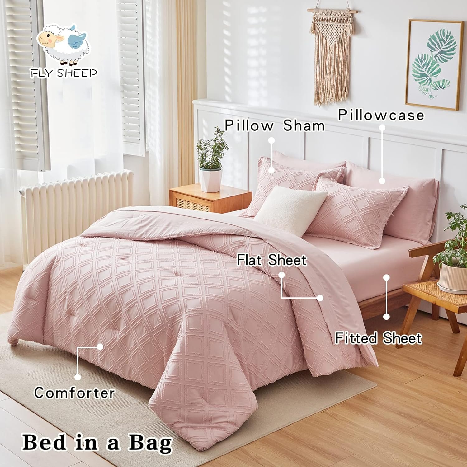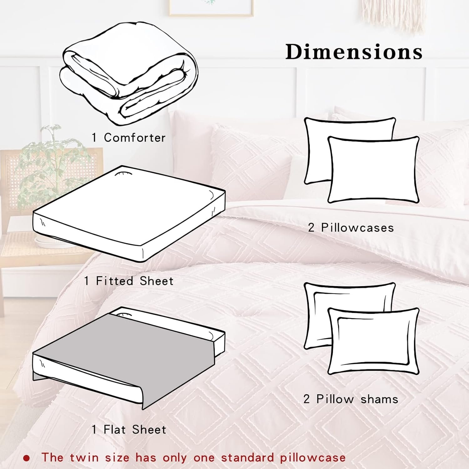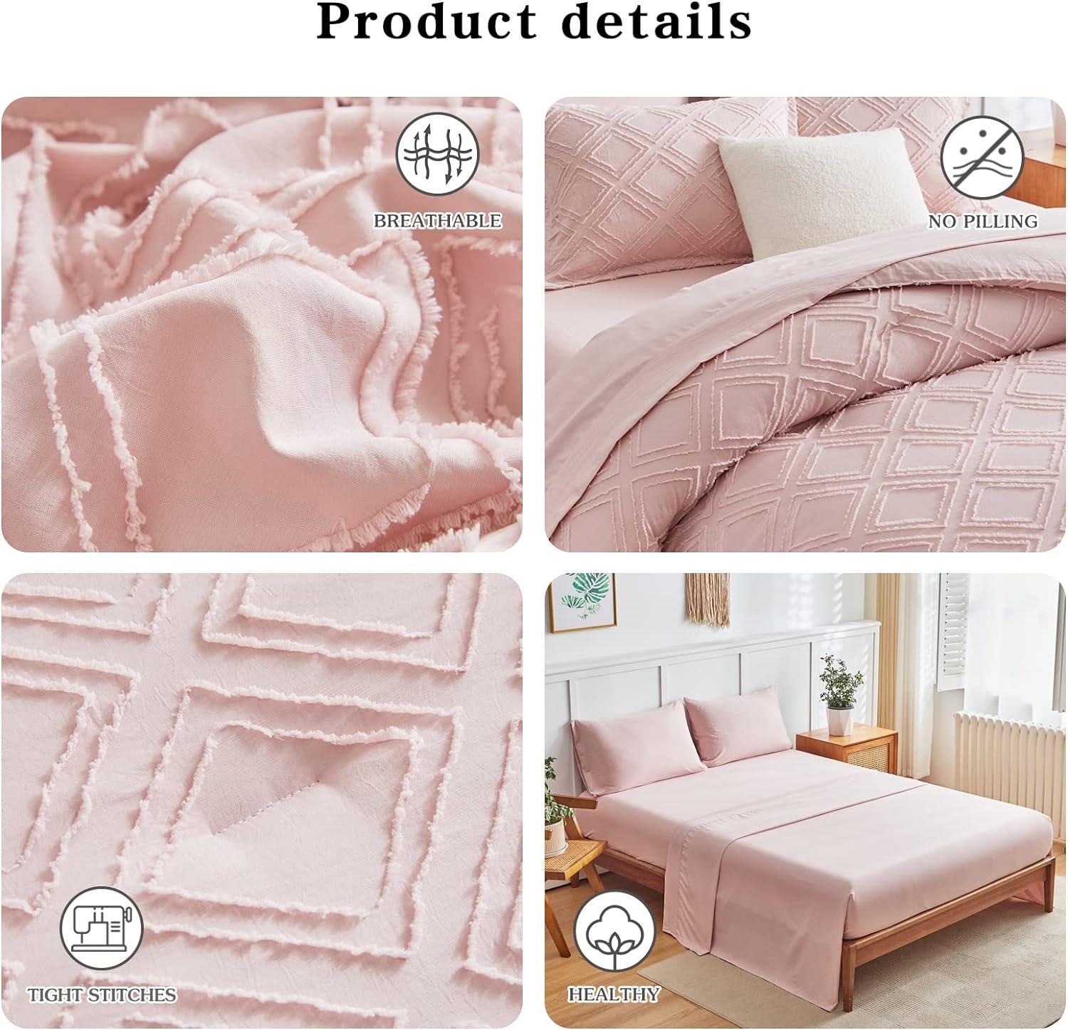 7 Pieces Tufted Bed in a Bag Queen Comforter Set with Sheets Blush, Soft and Embroidery Shabby Chic Boho Bohemian, Luxury Solid Color with Diamond Pattern, Jacquard Tufts Bedding Set for All Season