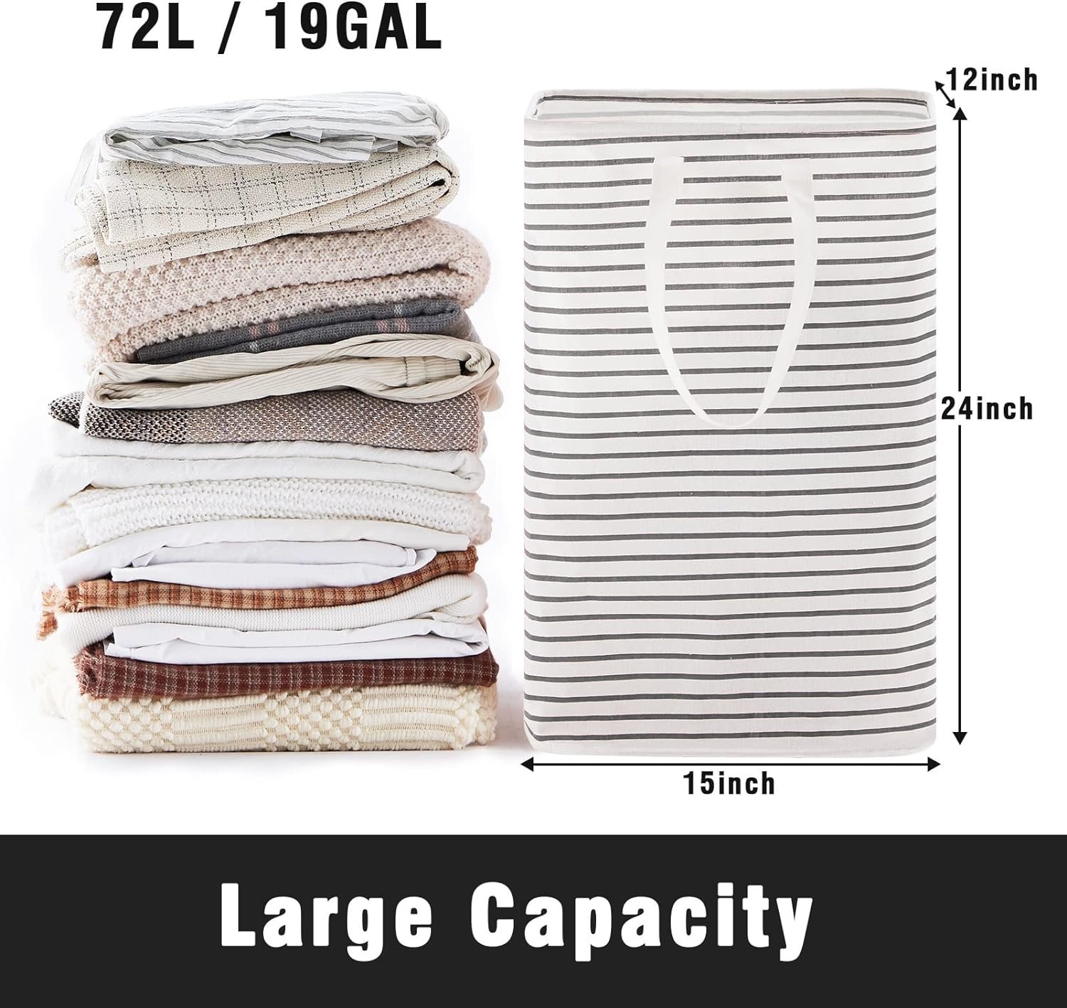 LARGE CAPACITY: Size – 23.6 x 15 x 11.8 inches, Volume – 72L. Great for storing loads of dirty clothes, towels, sheets, duvet covers, and etc.