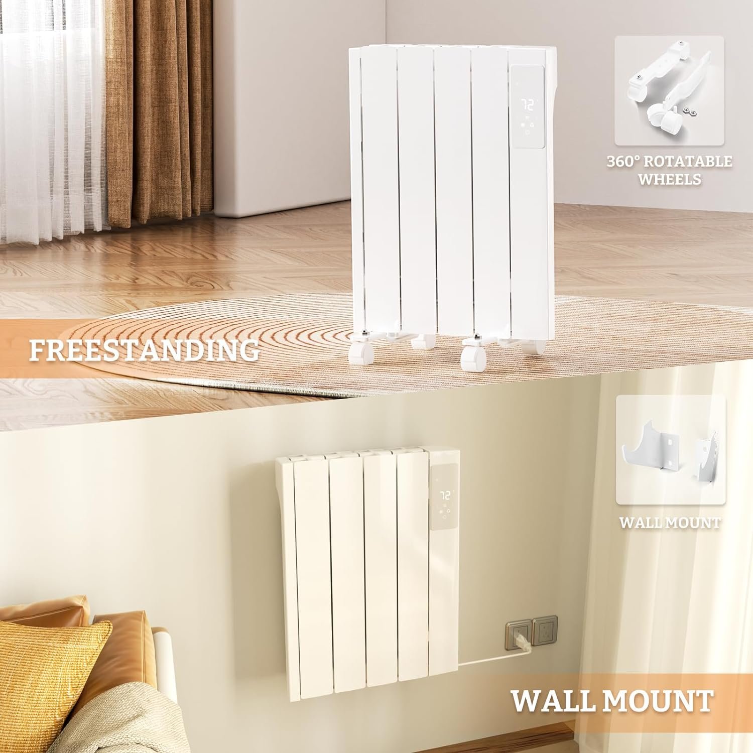 【Versatile and Stylish】With a sleek aluminum frame and white finish, this panel heater blends in with any decor. It can be mounted on the wall with the included hardware or moved around with its universal wheels. Suitable for any space, from bedroom to office.