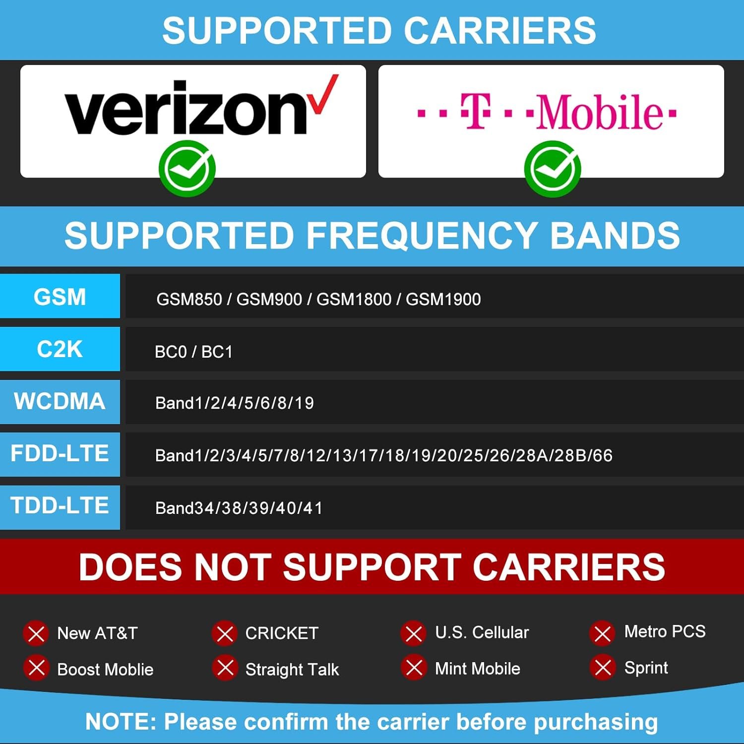 【Support T-Mobile & Verizon Carrier】Tank 2 rugged phone unlocked only support T-Mobile and Verizon Carrier; For other Carrier, you need check the frequency bands,our smartphone can support frequency bands: GSM(GSM850/GSM900/GSM1800/GSM1900);C2K(BC0/BC1); WCDMA(Band1/2/4/5/6/8/19); FDD-LTE(Band1/2/3/4/5/7/8/12/13/17/18/19/20/25/26/28A/28B/66); TDD-LTE (Band34/38/39/40/41); if you still has any questions, Please confirm the carrier before purchasing, we will tell you how to use the some carrier