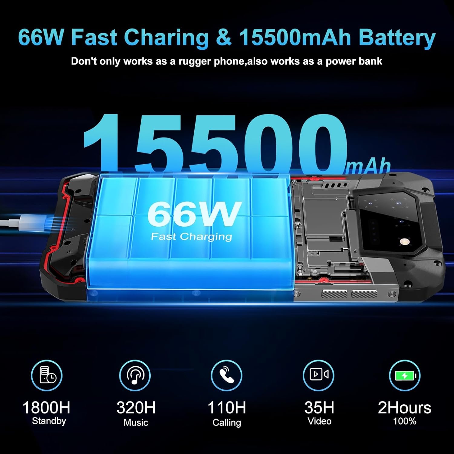 【15500mAh Battery & 66W Fast Charging】Tank 2 unlocked rugged smartphone equipped with 15500mAh battery will provide a more durable usage time. Meanwhile, the rugged cell phone designed with OTG function doesn’t only work as a unlocked rugged android phones, also work as a power bank in emergency situations. Not only that, with 66W fast charging function to finish 100% charged about 2 hours. Whether it’s playing games or watching videos, you don’t worry about your phone running out of battery