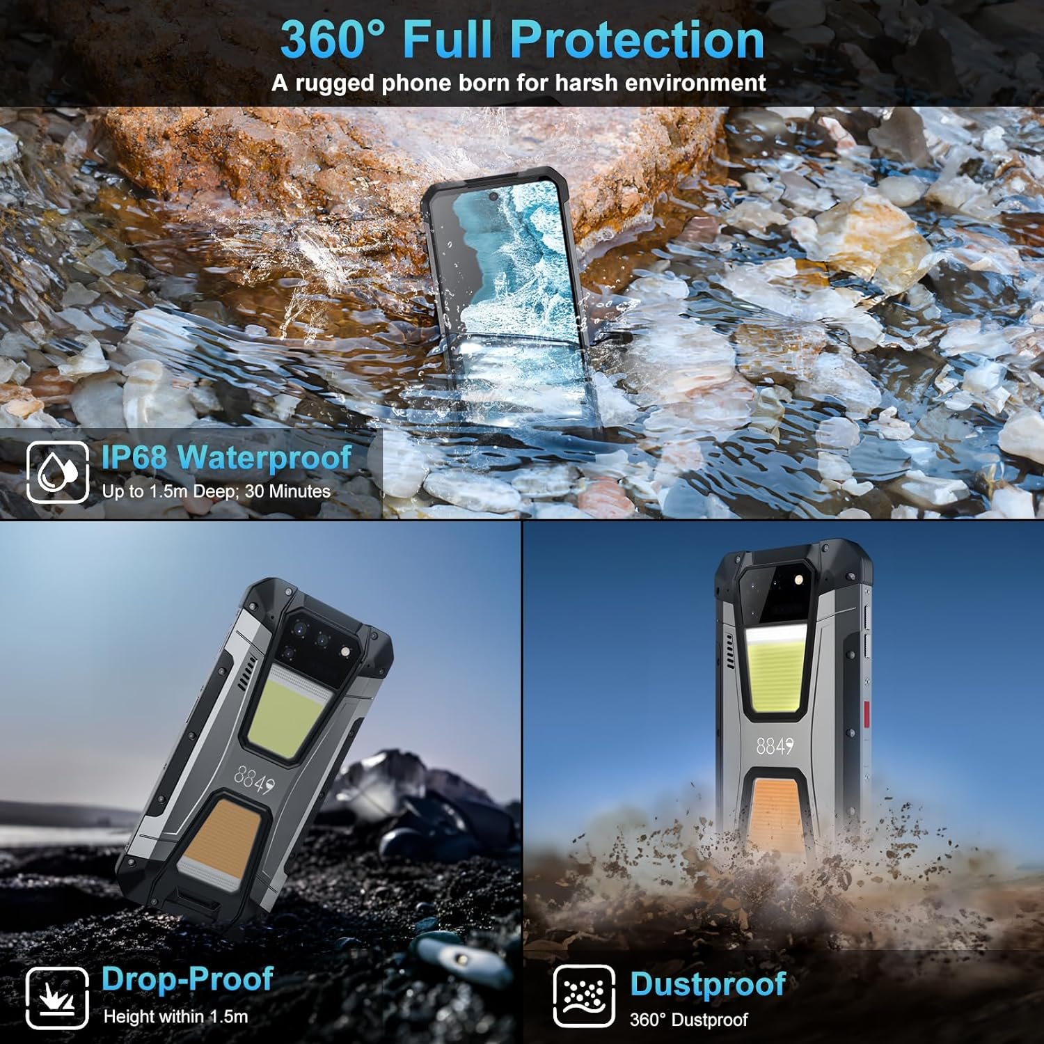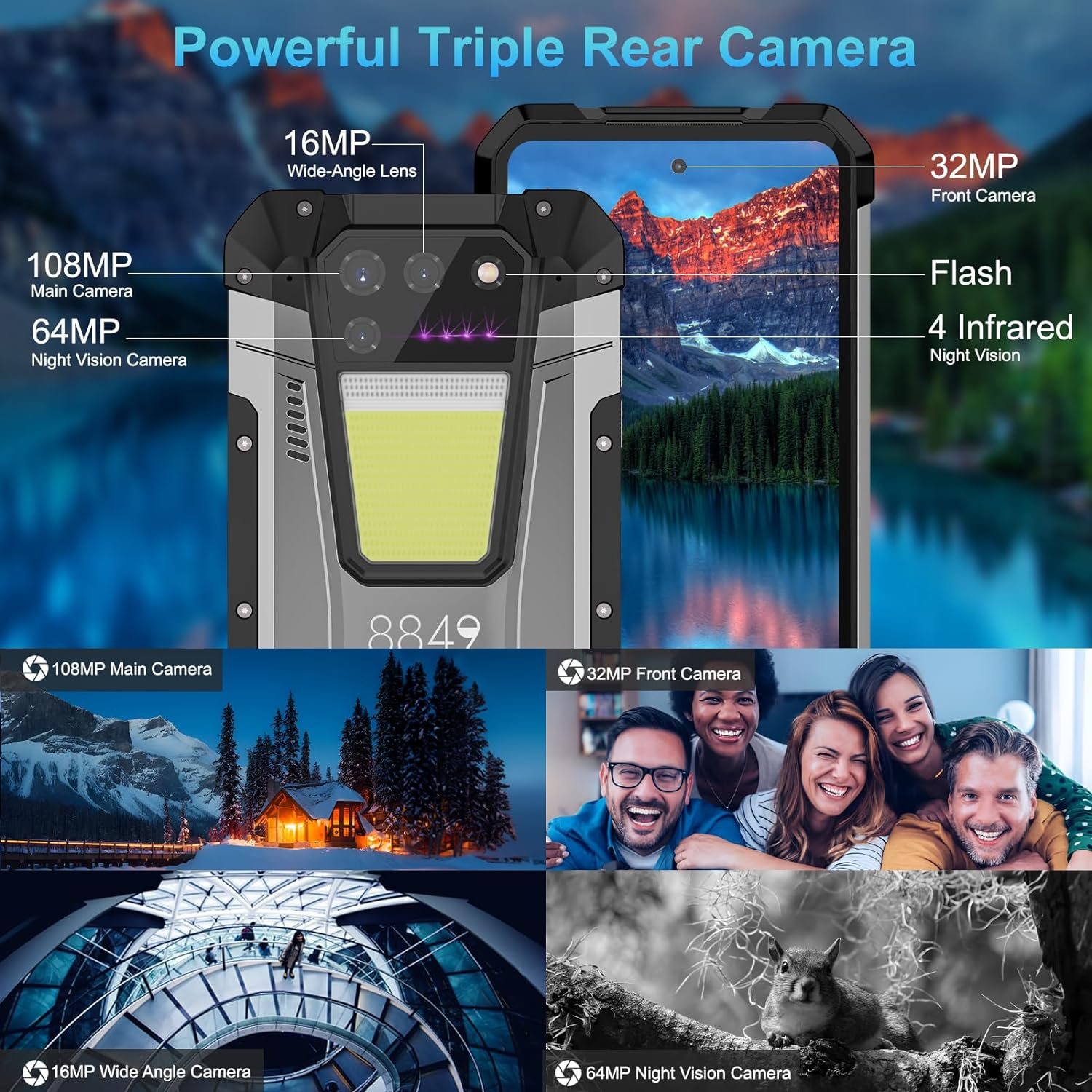 【Upgraded 64MP Night Vision Camera】8849 Tank 2 outdoor rugged phone with a 108MP main camera, you can capture images with remarkable clarity and detail; the 32MP front-facing camera supports beauty selfies, which makes you can enjoy beauty at any time; Of course, if you like night photograph, 8849 rugged cell phones unlocked with 64MP night vision camera can capture many beautiful moment that ordinary phones can’t capture. Meanwhile, 16MP wide angle camera for more sense view