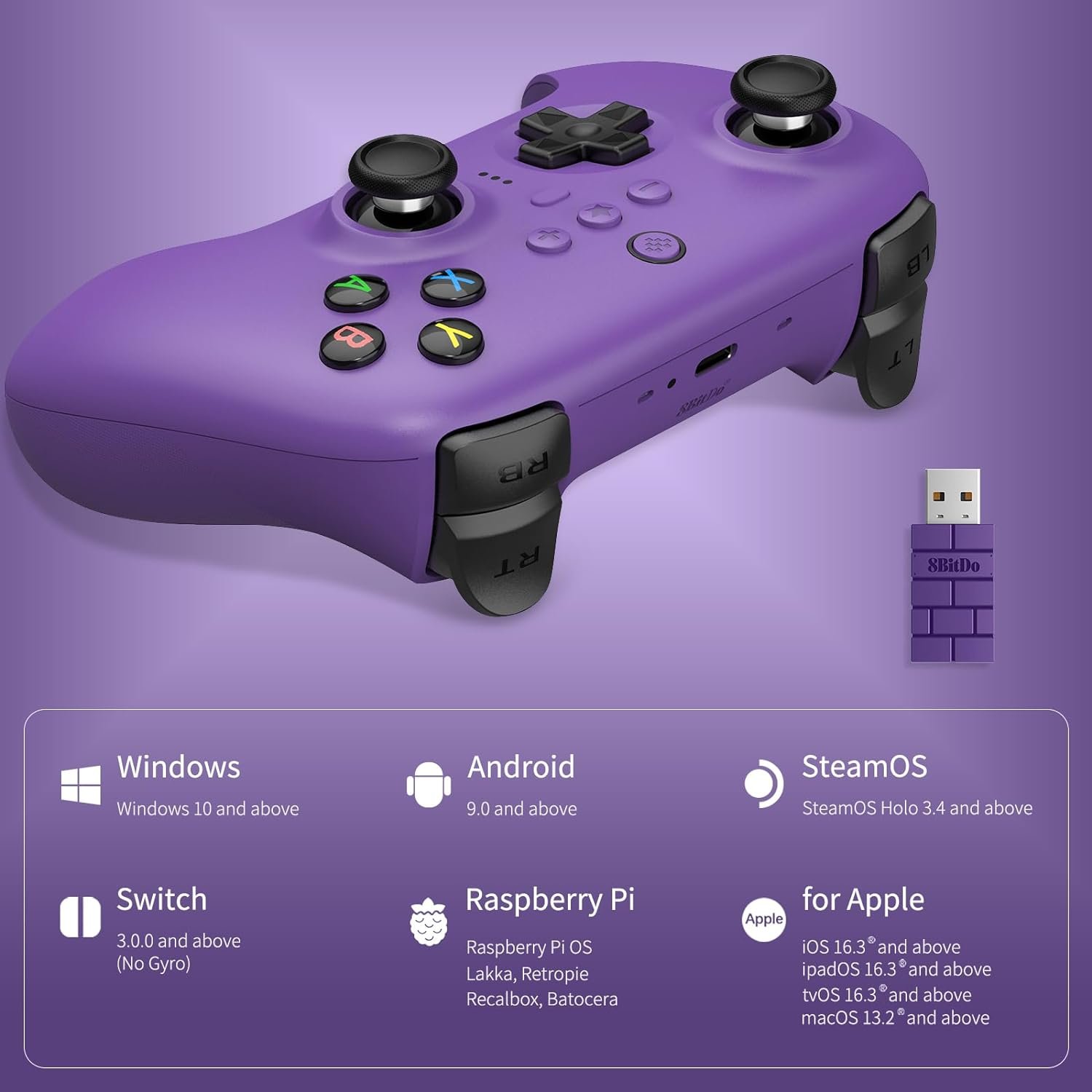 Compatible with multiple platforms including Apple(iOS, iPadOS, tvOS, macOS), Windows, Steam Deck, Raspberry Pi and Android devices. (Supports Switch via wired connection but does not include NFC / motion control / IR / HD rumble and wake up funtion.)
