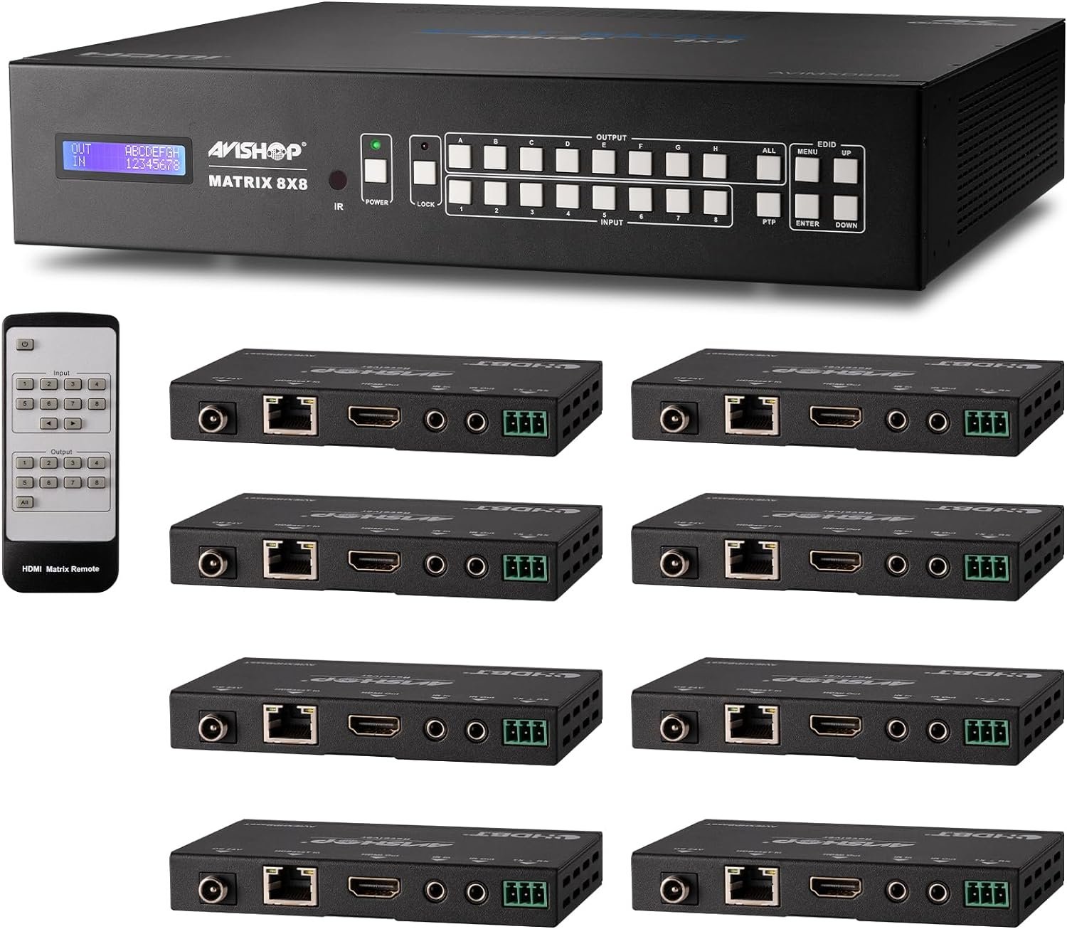 Thank you for purchasing this product with AVIshop. This AVIshop HDbaseT Matrix 8×8 4K HDMI Matrix Extender Switcher gives up to 8 connected displays to play 8 different HDMI sources at the same time. Each output has separate analog Audio and SPDIF audio extractor. This product comes with 8 HDbaseT receivers.These receivers support power through Cable (cat5e/6 cable recommended), so you only need to plug two power cords into the Matrix and the power will pass through the cable to the receivers. No more power plug needed to connect with receivers. This product support resolution up to 4Kx2K@60 HZ and transfer signal through cable5e/6 up to 70m / 228ft. This type of switch is also perfect for media in sports bars, casinos, hotels, custom homes, apartments and nightclubs.