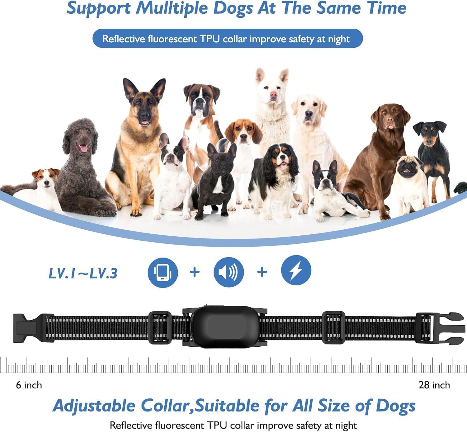 【Thoughtful & Safe Design】The dog fence collar is adjustable. The length of the collar is 8 – 28 inches, which makes it suitable for all size of dogs (10 to 110 pounds,not for very small dog). Come with 4pcs conductive posts, 2 small ones for short hair dogs, 2 large ones for long hair dogs, as well as 4pcs of Silcone caps, to be used after training.The wireless pet training collar is made of reflective fluorescent TPU material, which improves the safety of dogs at night.